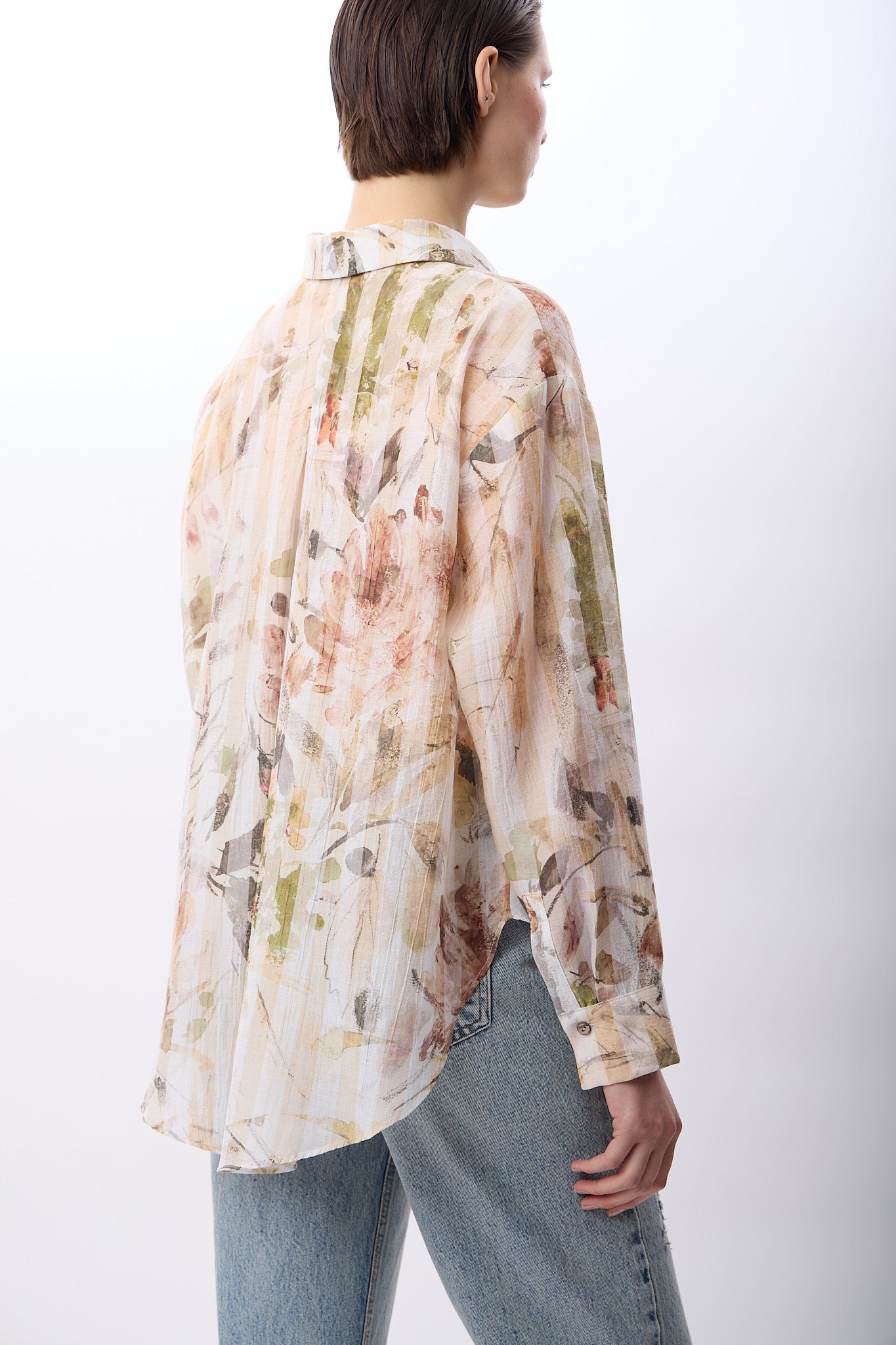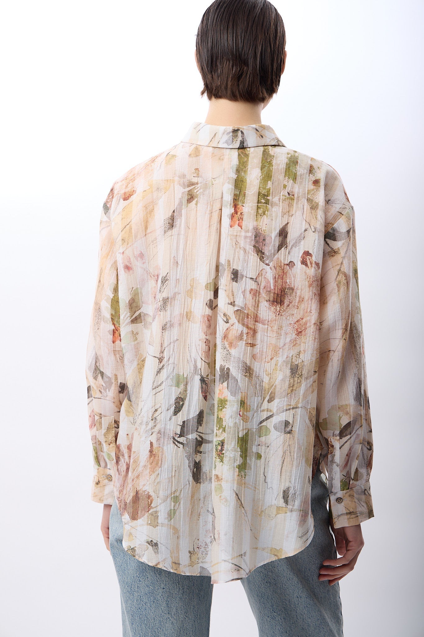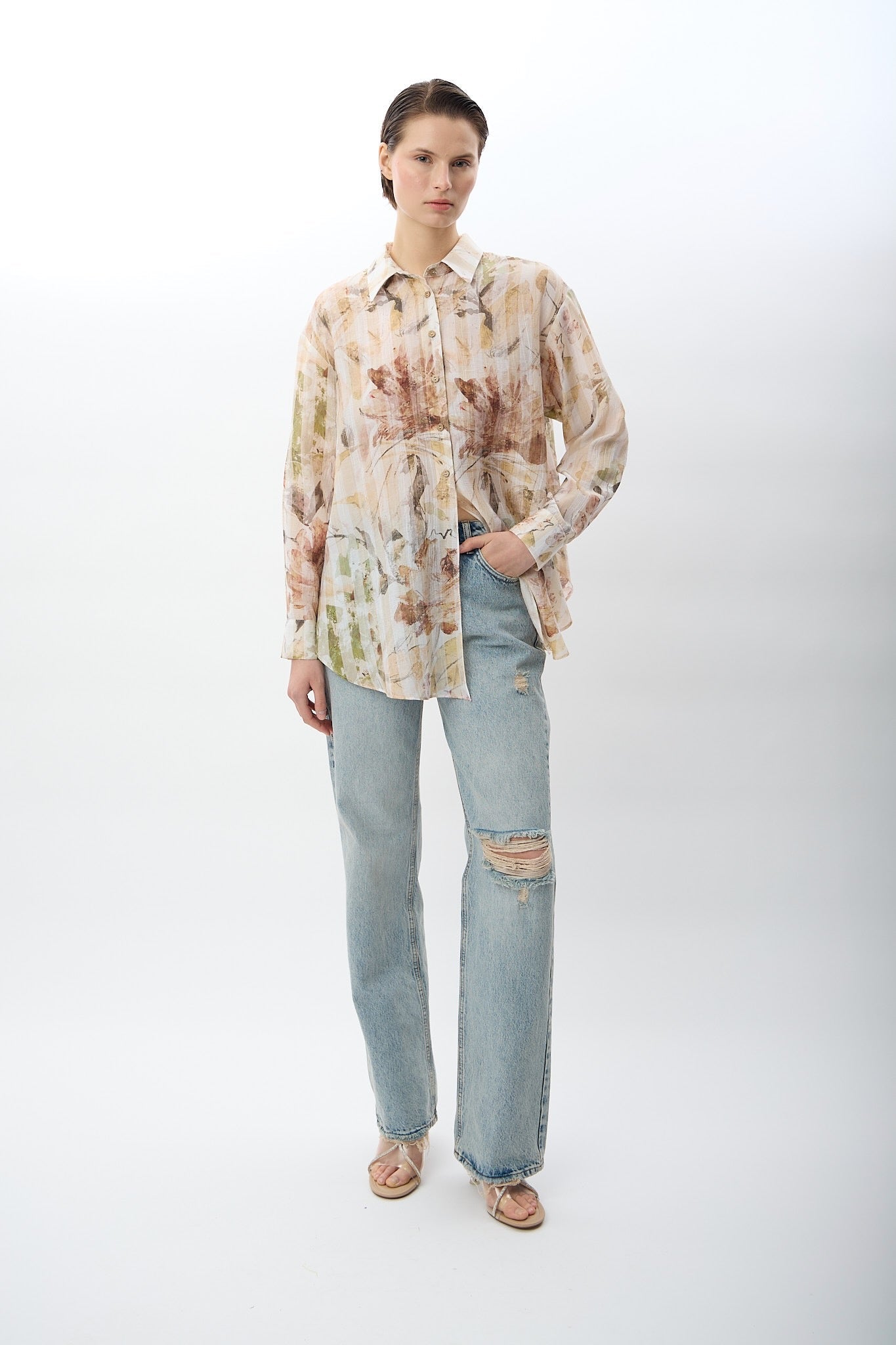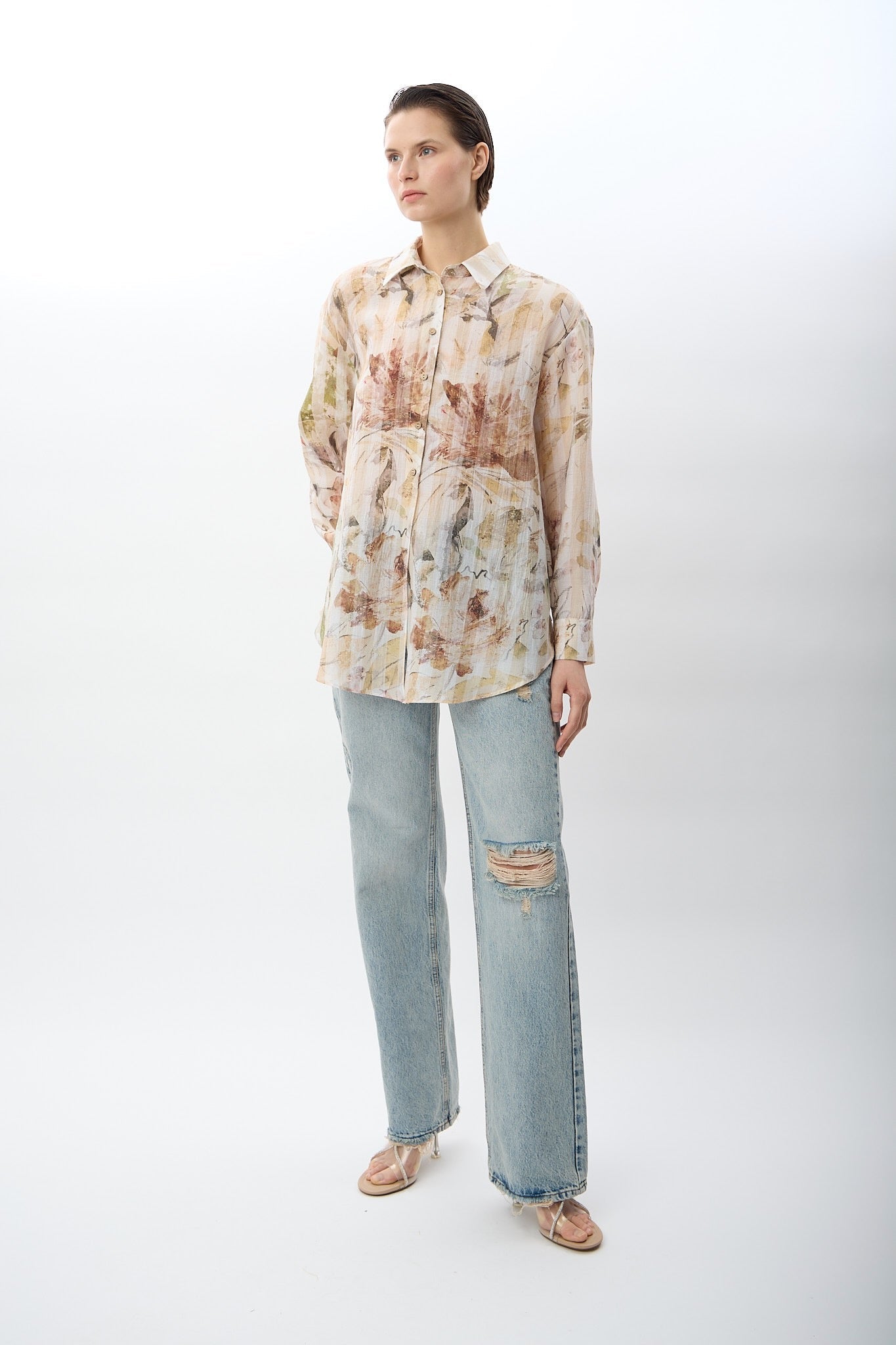 Uzun Kollu Çiçek Desenli Gömlek (Bej)
