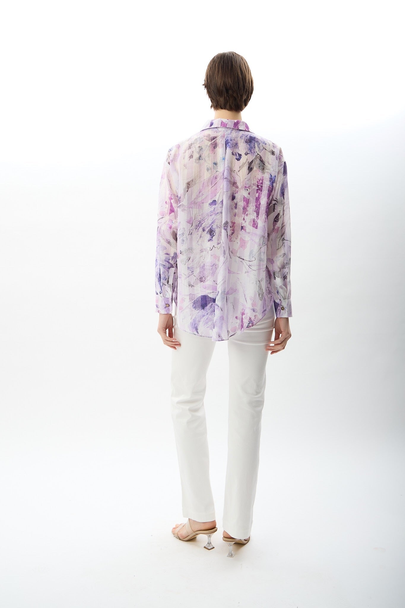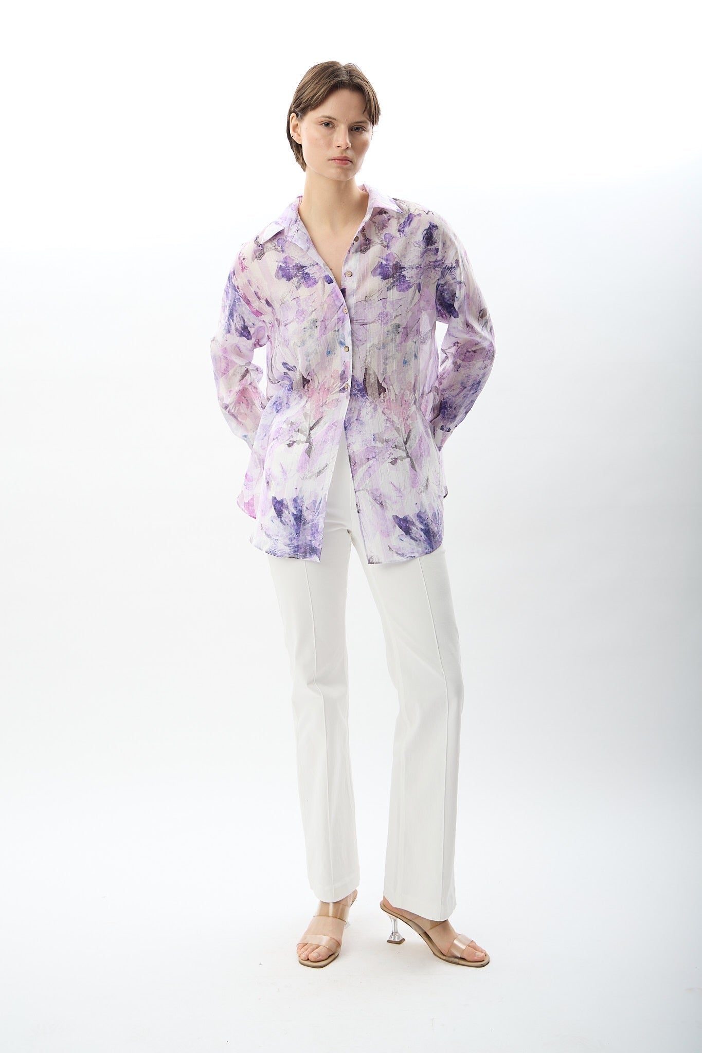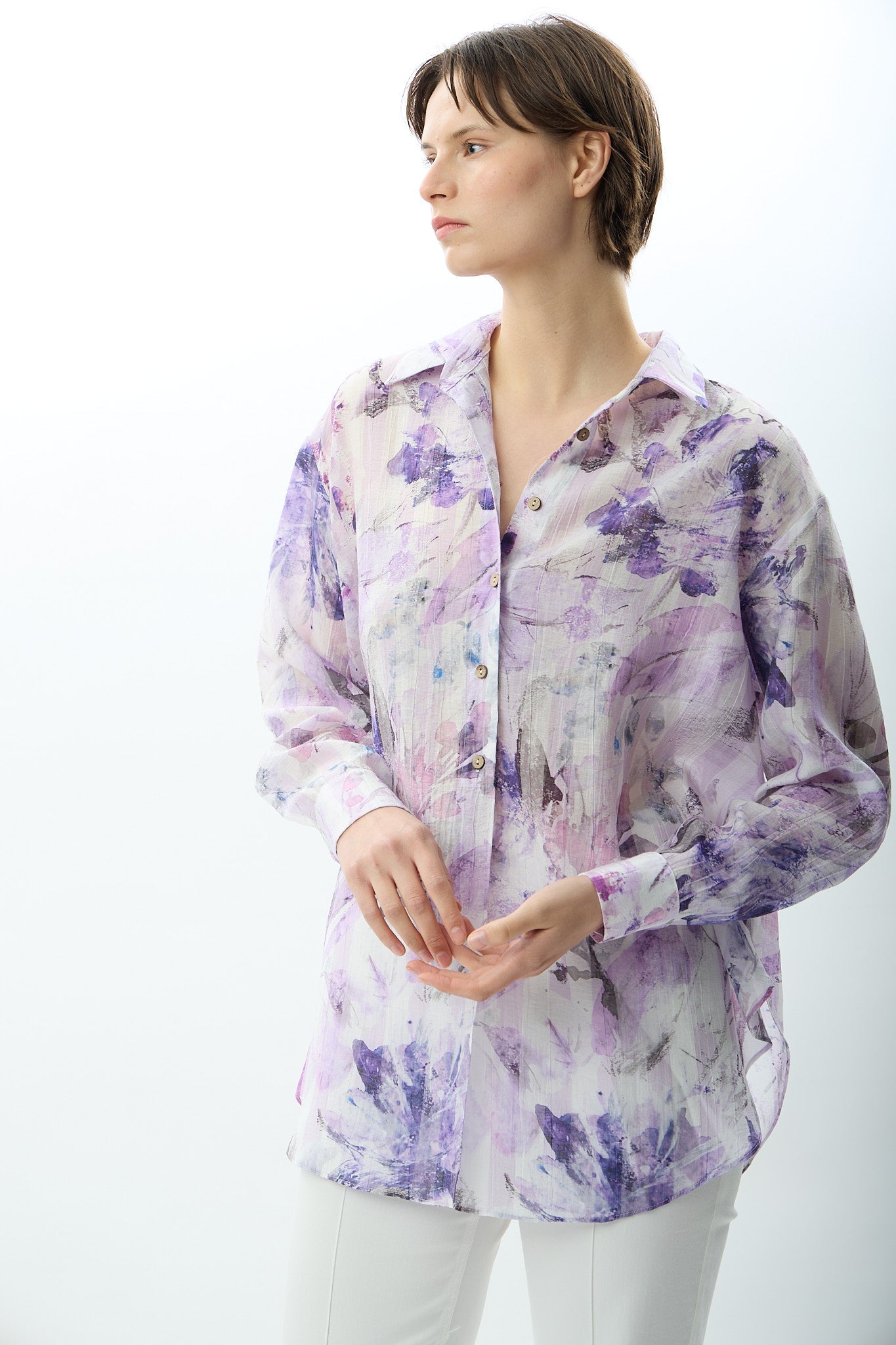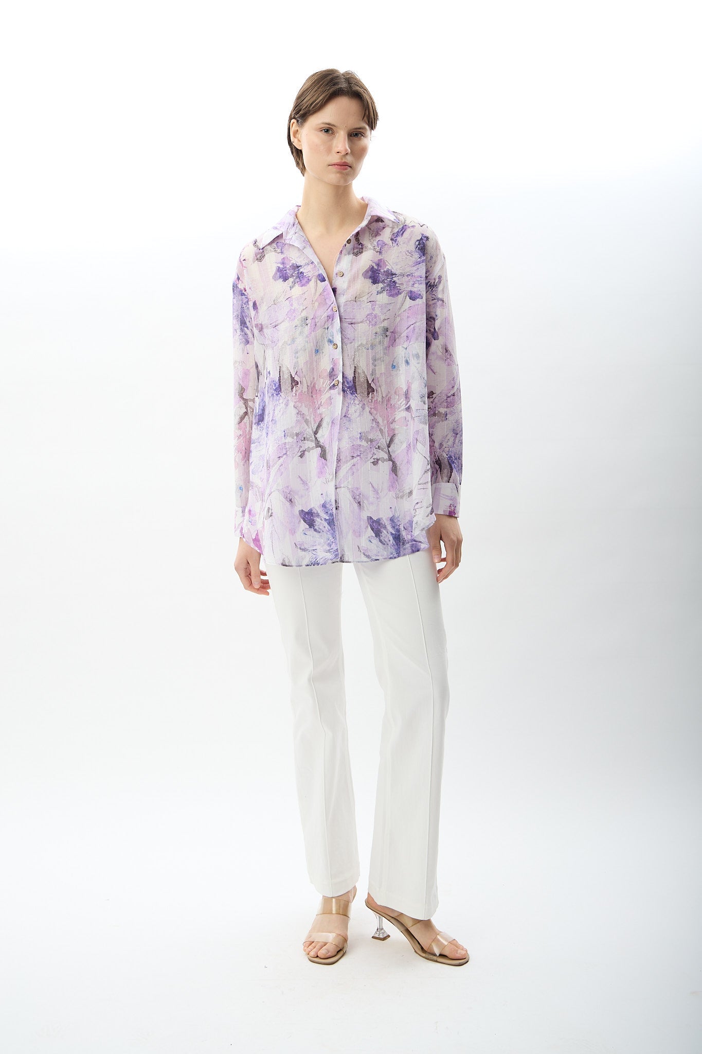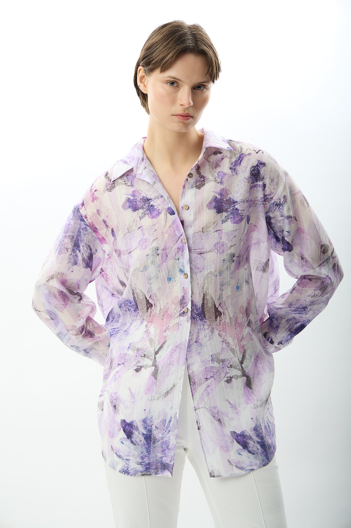 Uzun Kollu Çiçek Desenli Gömlek (Lila)
