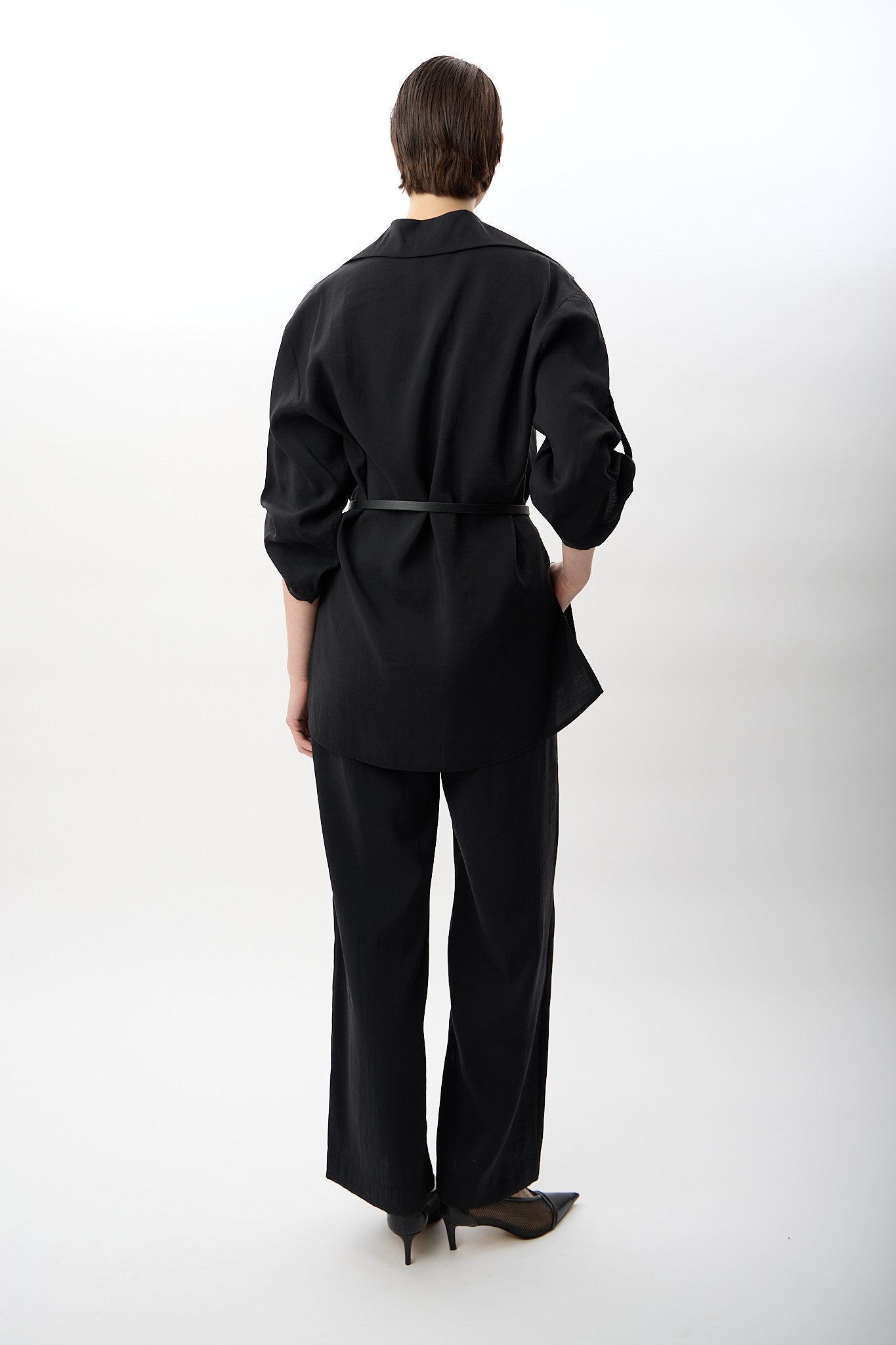Yırtmaç Detay Kemerli Gömlek (Siyah)