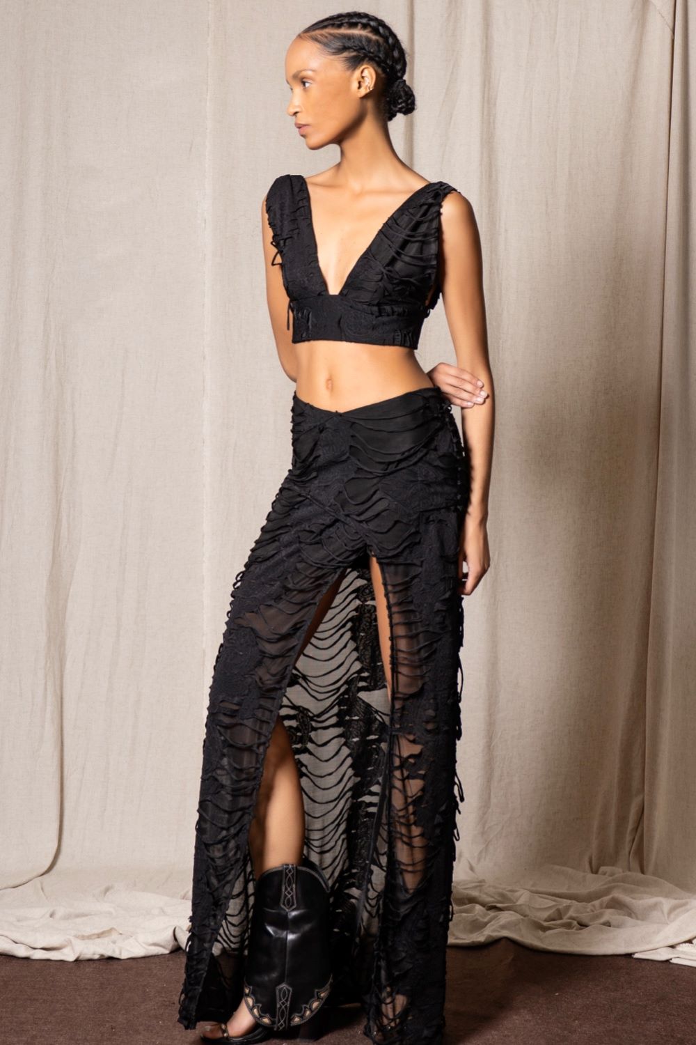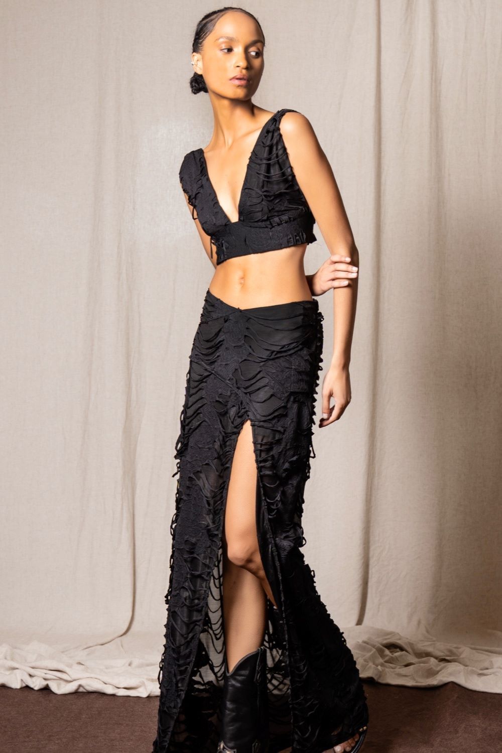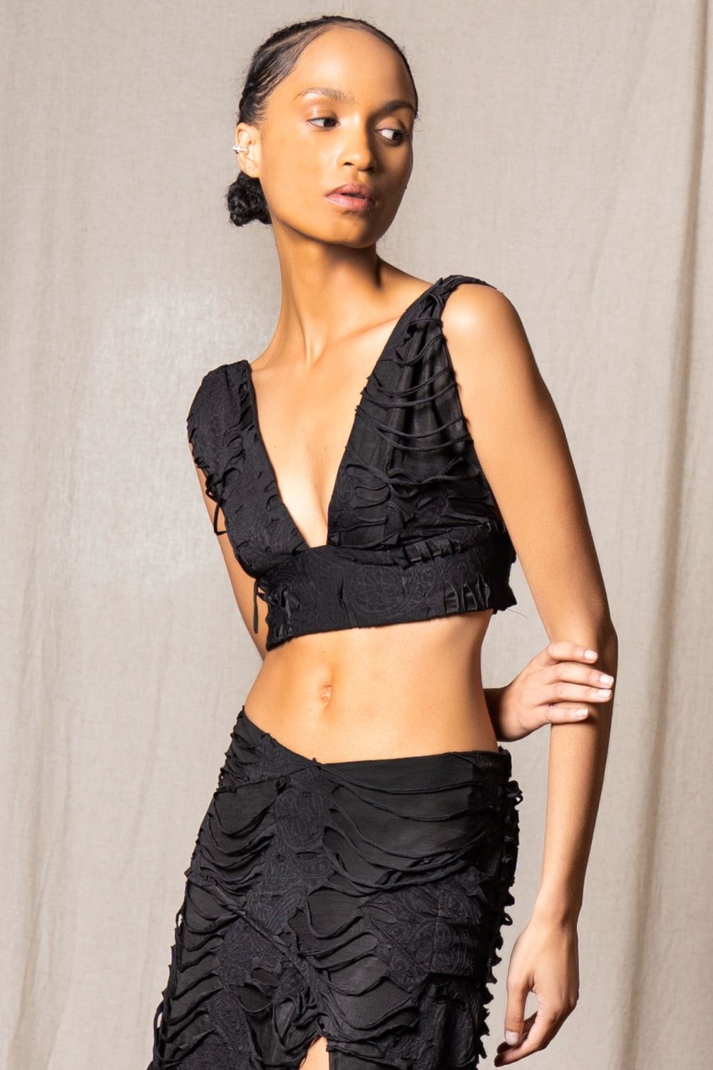Bir yüzünde lazer kesim yırtıkların ardında zarif dantel dokunuşları, diğer yüzünde ise saf siyahın asaleti…Ayarlanabilir düğme detayı sayesinde dekoltenizi tam size göre şekillendirebilirsiniz. Gündüz sade bir güç, gece asi bir şıklık…