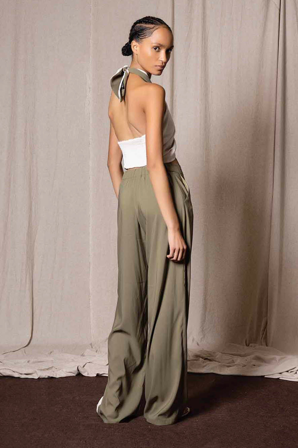 Uyum asla tekdüze değildir. Bazen iki zıt uç, tek bir bedenin ruhunu anlatır. Sınırları olmayan bir özgürlük hissi: Bu pantolon, salaş kesimi ve arkadaki lastik detayıyla hem yüksek bel hem düşük bel kullanımına imkan tanır. İki rengi kusursuzca buluşturan çapraz ön kesimi, sade bir kontrasttan fazlasını sunar Bir ifade, bir tavır yaratır. Pantolonun renk geçişi, büstiyerin ters giyimi ve kıvrılan uçlarıyla bütünleşerek, görünümüne her seferinde farklı bir ruh katmanı ekler. Hareketinle akışkan, tarzınla net.