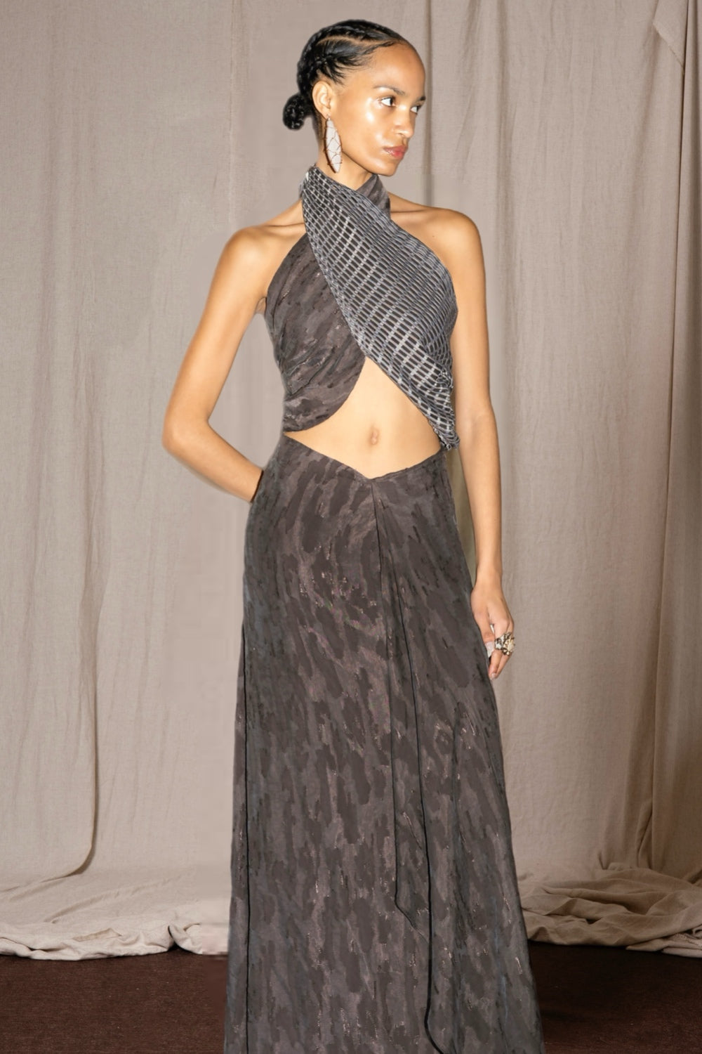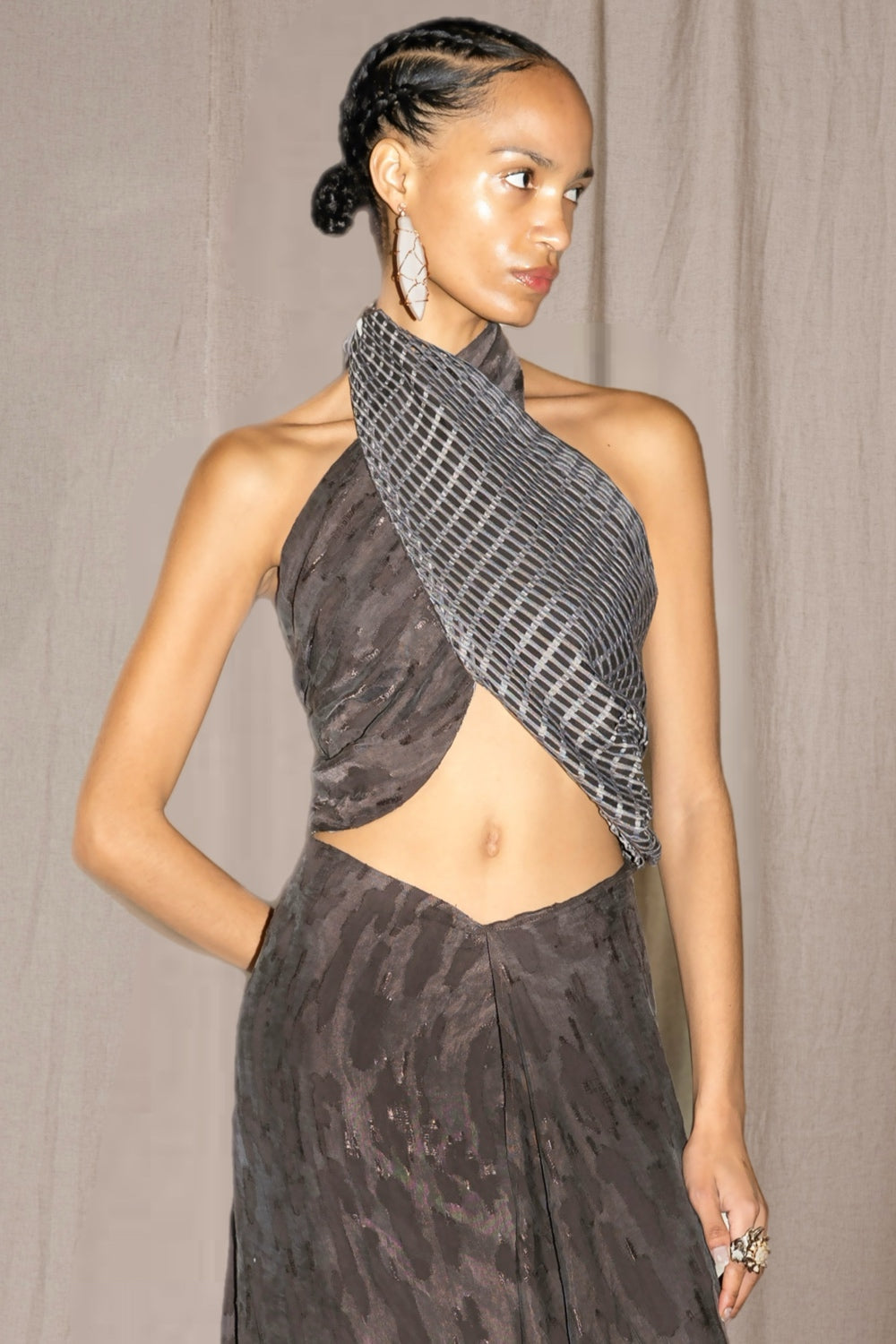 İki farklı enerji, tek bir büstiyerde buluşuyor. Boyundan bağlamalı ve sırt dekolteli bu özel tasarım, iki taraflı kullanılabilir formuyla günün ruhuna göre dönüşüyor. Bir yüzünde %100 organik vegan kupra kumaşın su gibi akan zarafetiyle eteğiyle birebir uyum yakalarken, diğer yüzünde kupra kumaşın asaleti file dokunun asiliğiyle buluşuyor. Her dönüş, senin seçimin. Her duruş, senin tarzın.