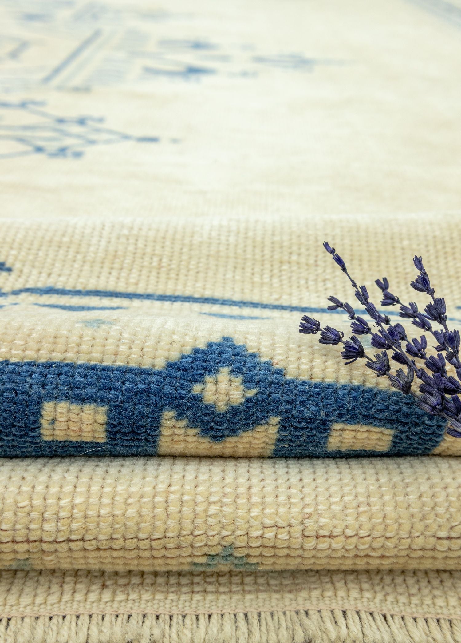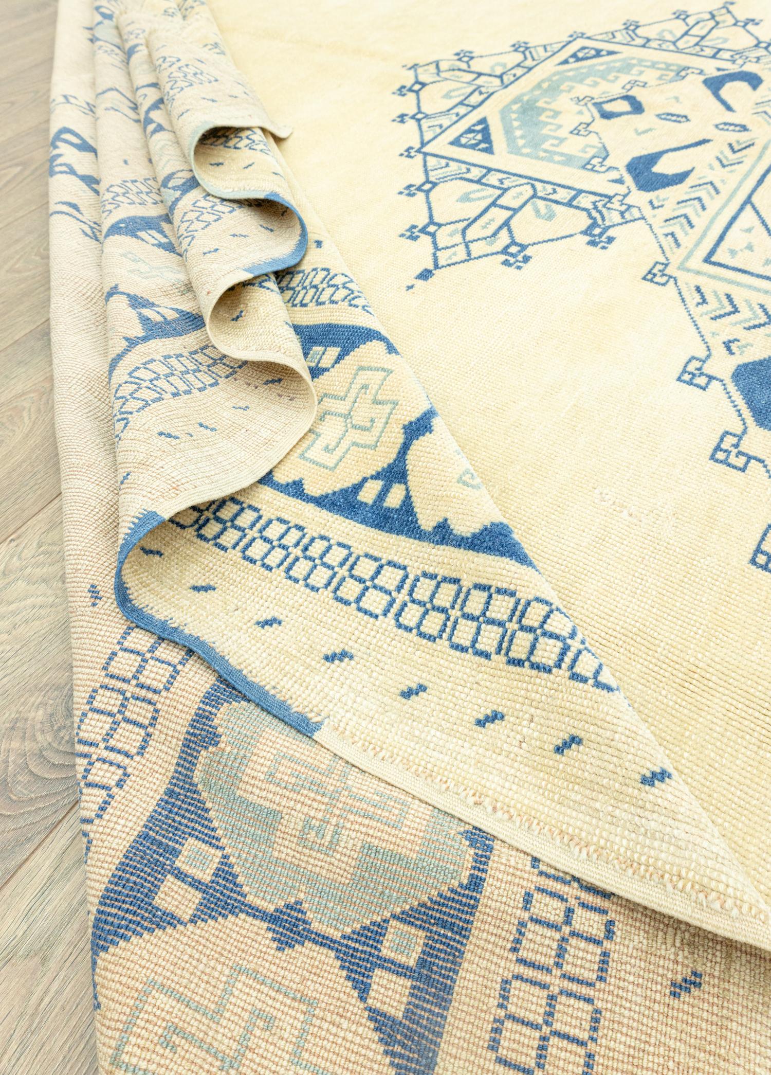 Soho Antiq el dokuma halı ve kilimleri, yaşam alanlarınızanefes katmak için tasarlanmıştır. Bu zarif el dokuma halı, özenle seçilmişyüksek kaliteli yün ipliklerinin ustalıkla bir araya getirilmesiyleoluşturulmuştur. Geleneksel el dokuma teknikleri kullanılarak üretilen halı,evinize sıcaklık ve zarafet katmak amacıyla özel olarak tasarlanmıştır. Renkpaleti, doğanın yumuşak tonlarından ilham alınarak oluşturulmuş olup, krem ile mavi renklerinin uyumuyla dikkat çekerken halı içerisinde bulunan diğer renkler ileuyumu yakalamaktadır. Halı, deneyimli el sanatçıları tarafından özenle dokunmuşve Uşak yöresine özgü geleneksel tekniklerle 1990'larda üretilmiştir, bu da halıyakültürel bir derinlik katmaktadır. Halının ebatı 278 x 372 cm olarak ölçülmüştürve bu ölçü, halının farklı yaşam alanlarına kolaylıkla uyum sağlamasını sağlar.Halının kalınlığı ise 1 - 3 cm arasındadır. Estetik değerinin ötesinde, bu eldokuma halı, evinize özgünlük ve geleneksel bir his katma konusunda öneçıkmaktadır.