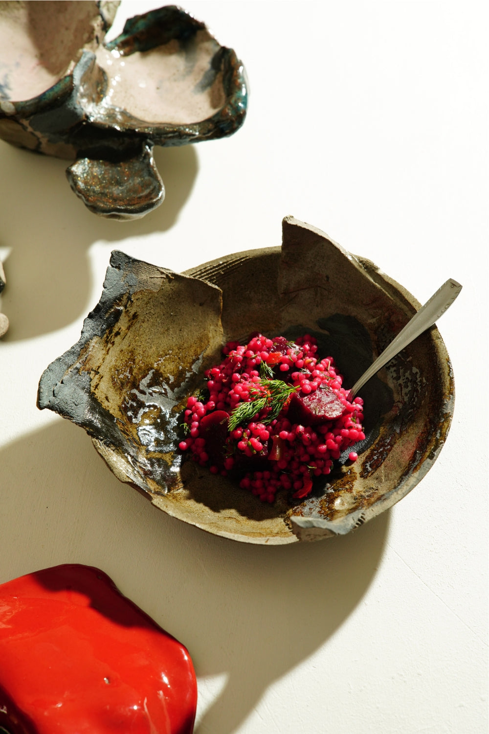 Doğu Anadolu'dan getirilen demir oksitler ve gıdaya uygun transparan sır ile desenlendirilen bu tabak, sosluğu ile birlikte sunulmaktadır. Keskin dokular ve sert tonlar arayan sofralar için özgün bir tercih.