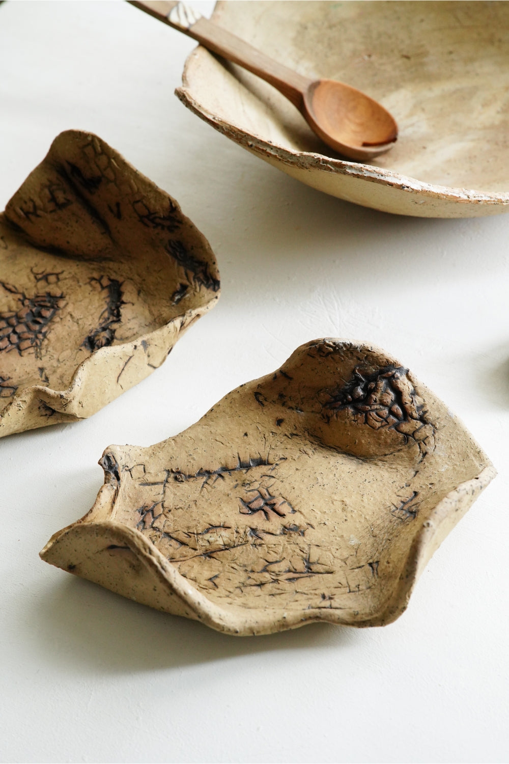 Derin baskılarla kaplanmış bu tabak, dokusal detayları ve içindeki siyah gıda uyumlu sır ile dikkat çeker. Hem şık hem de fonksiyonel olan bu tabak, sofistike bir görünüm sunar.