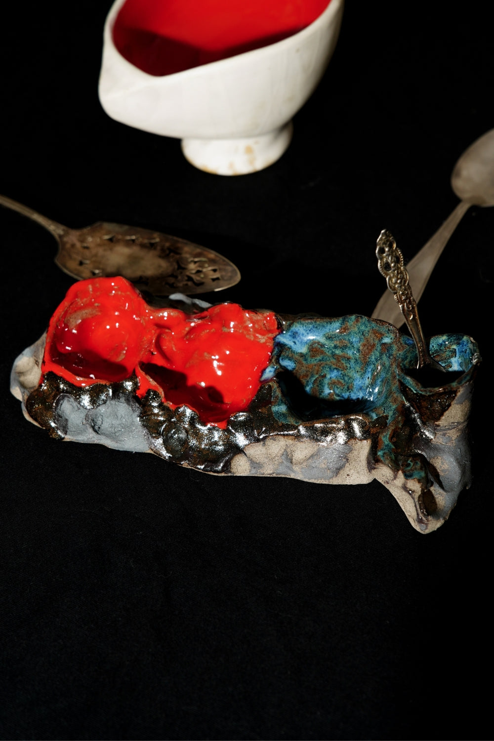 Kırmızı Stoneware Mini Sosluklar Ve Kaşıklık