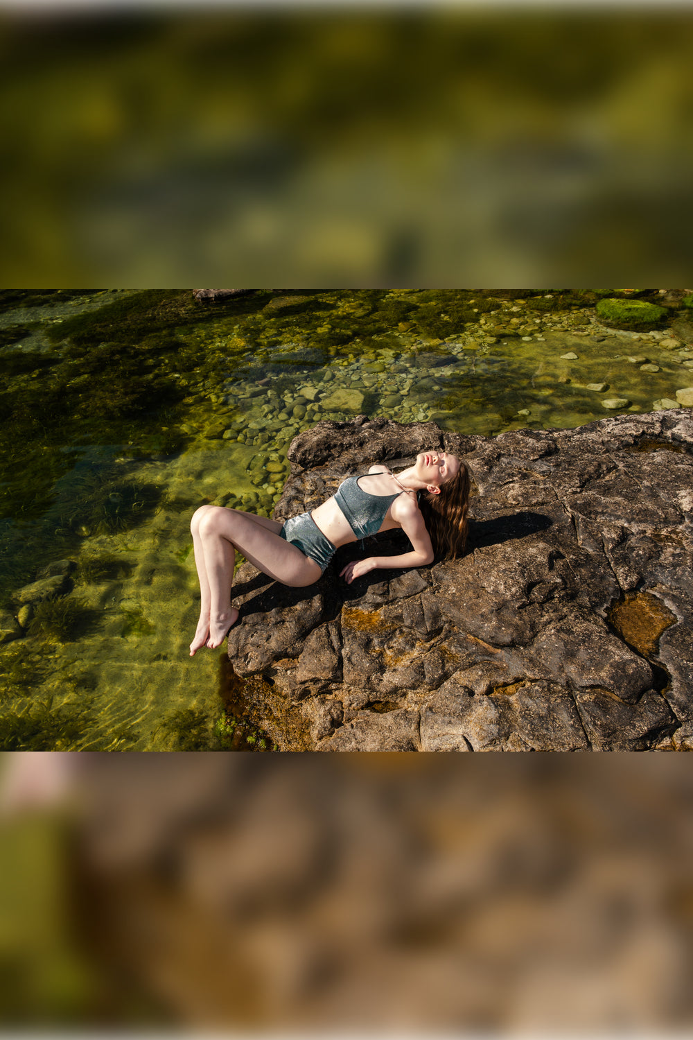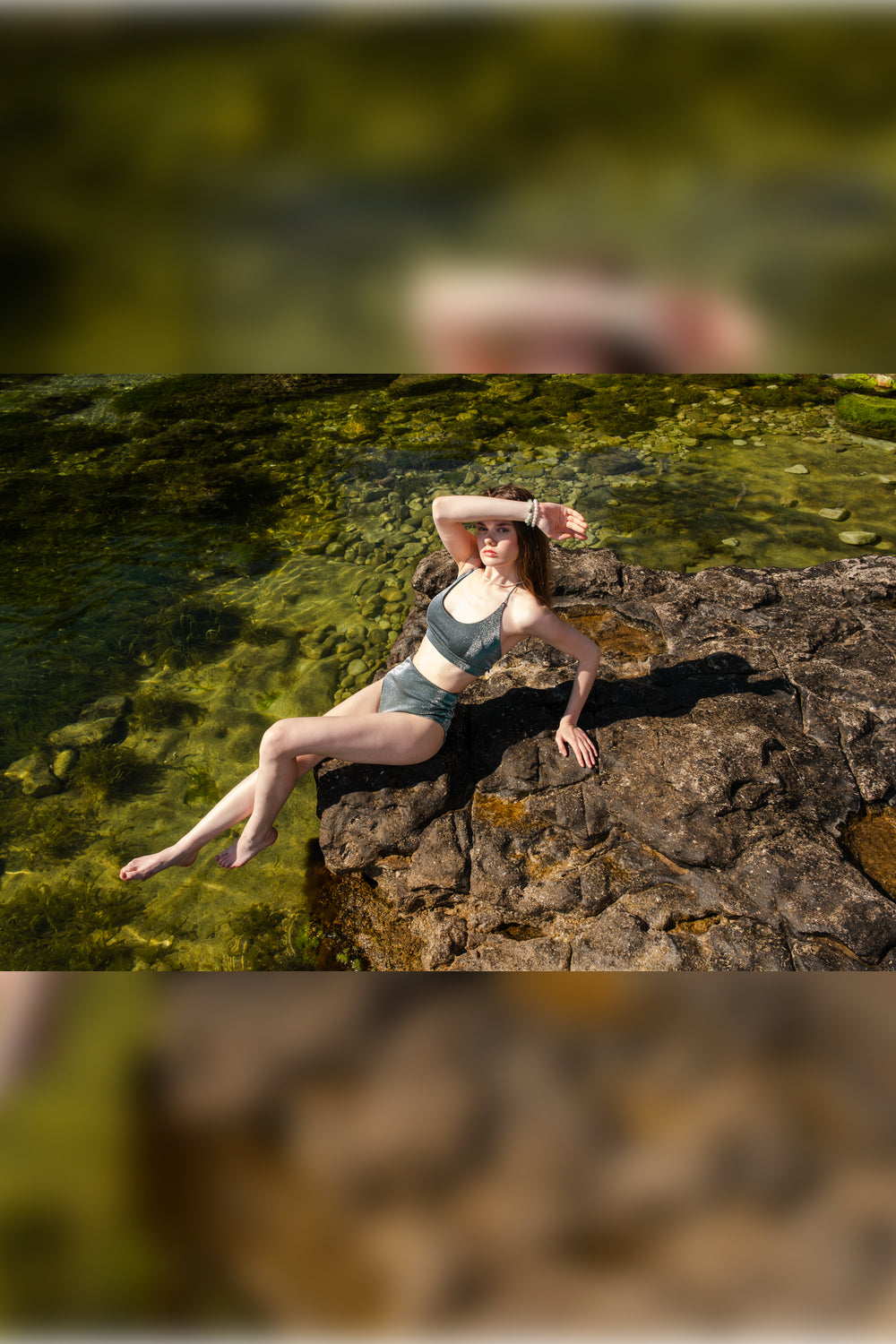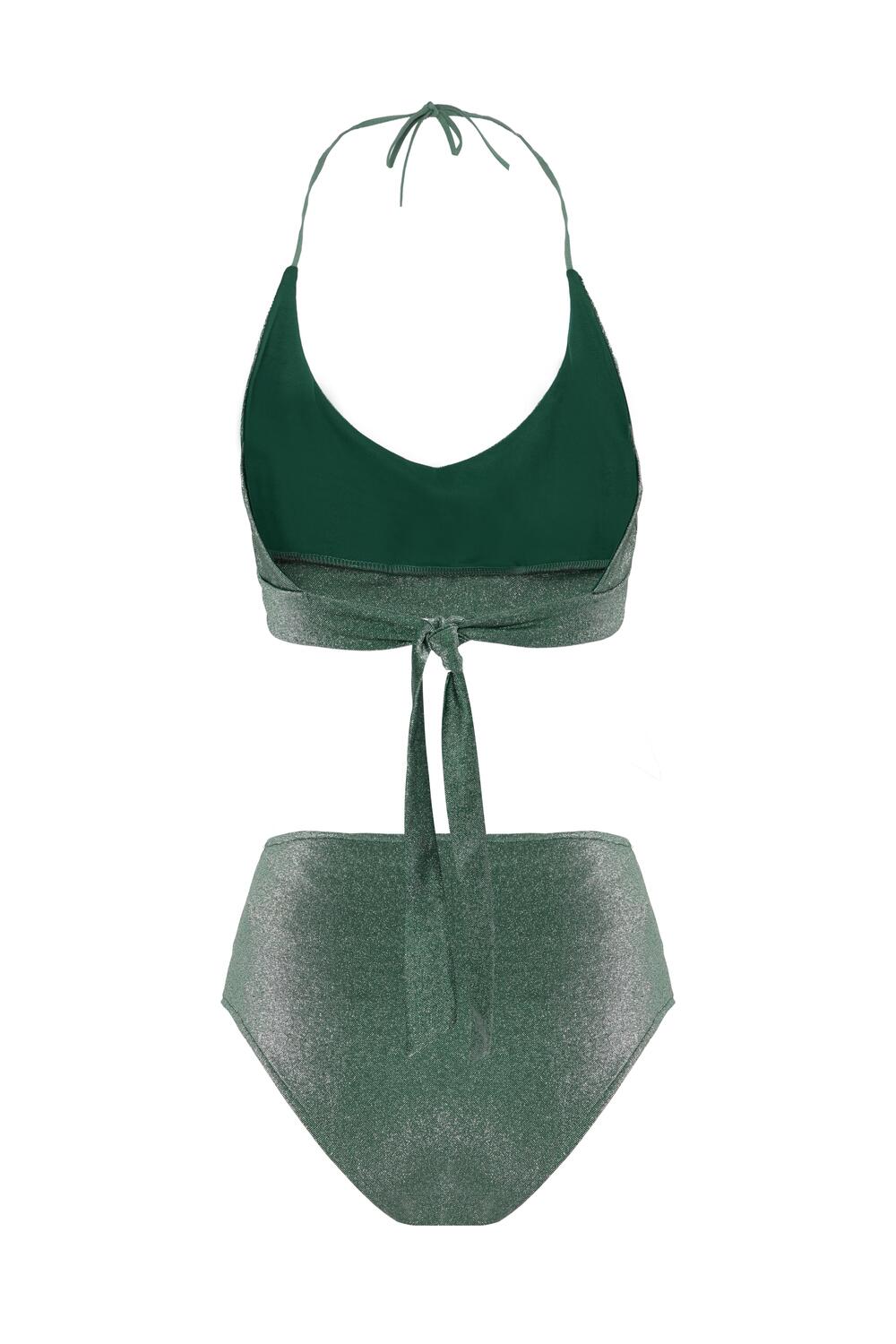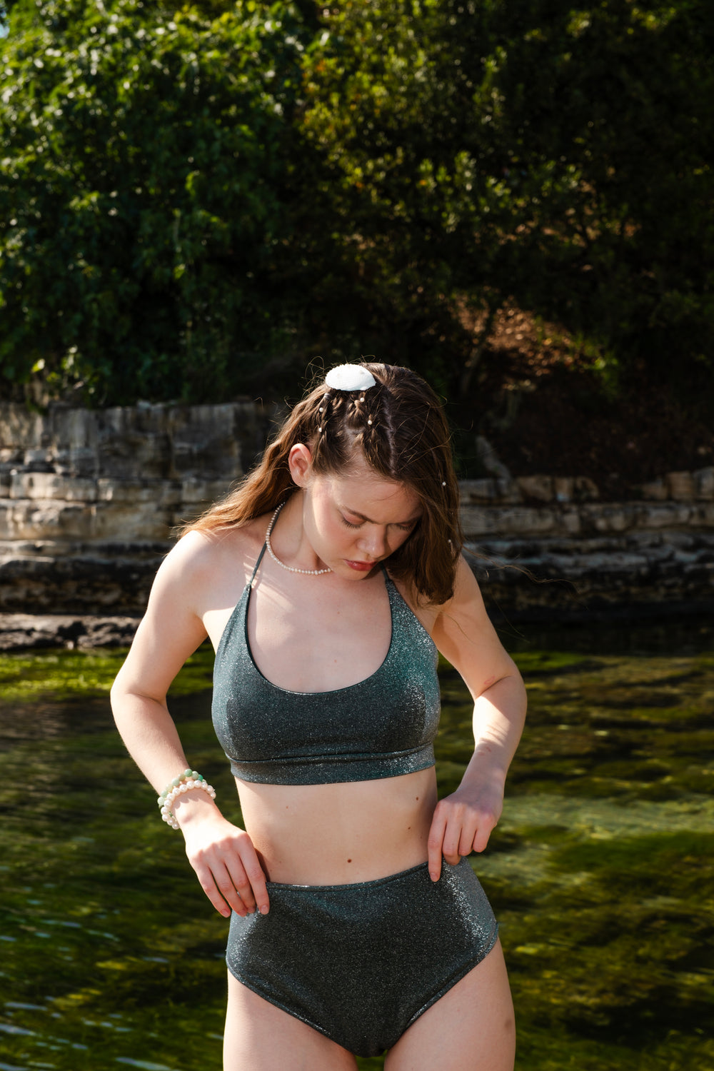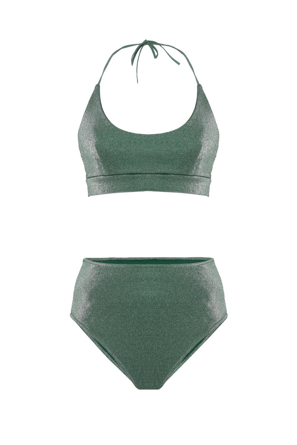 Lined, non-wired bikini top that ties at the neck and back. High-waisted, fully lined bikini bottom.