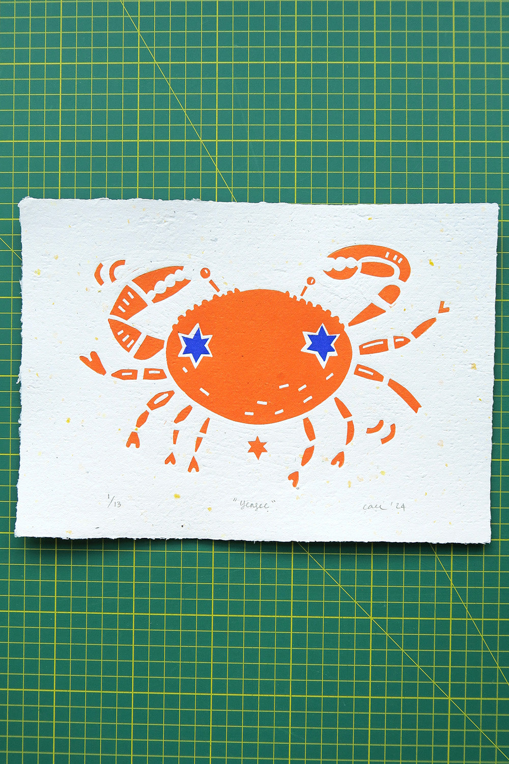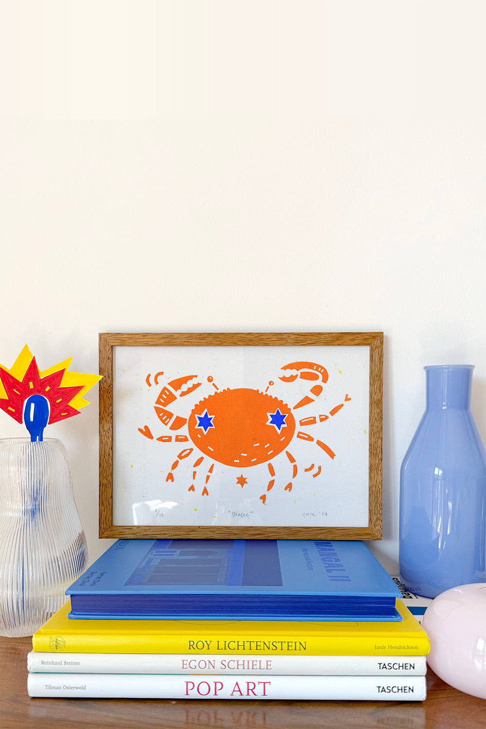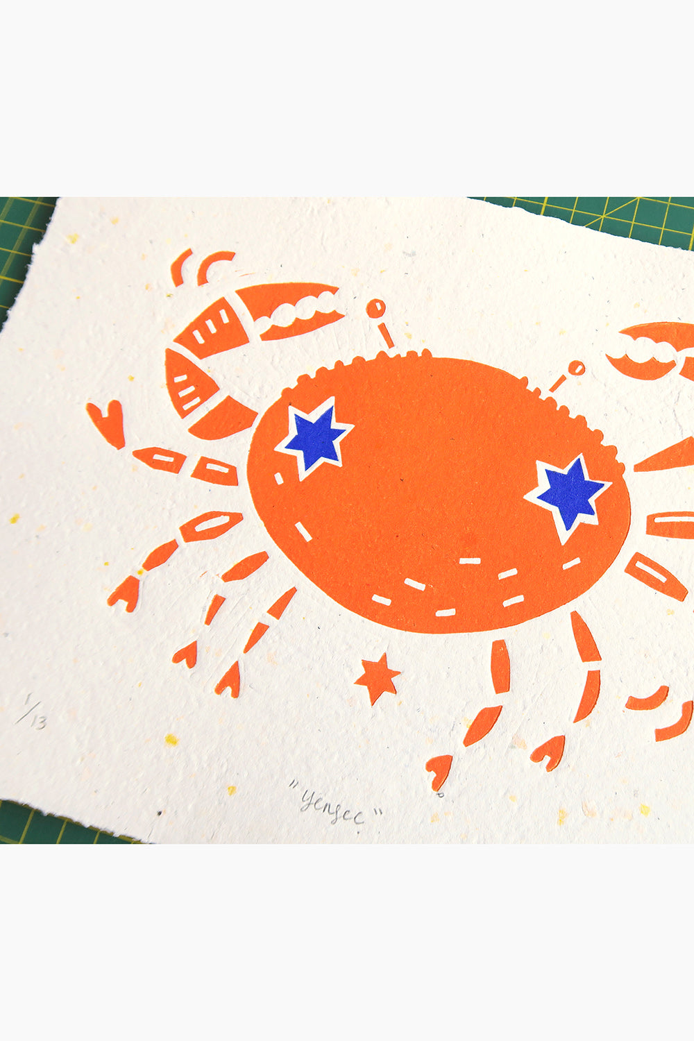 Deniz teması sevenler için "Yengeç" linol baskı.Bu sınırlı sayıda üretilmiş linol baskı ile ev dekorasyonunuza güzel bir dokunuş katın ve sanat koleksiyonunuza eşsiz eserler ekleyin. Her mekana mutluluk katmak için tasarlanmıştır.