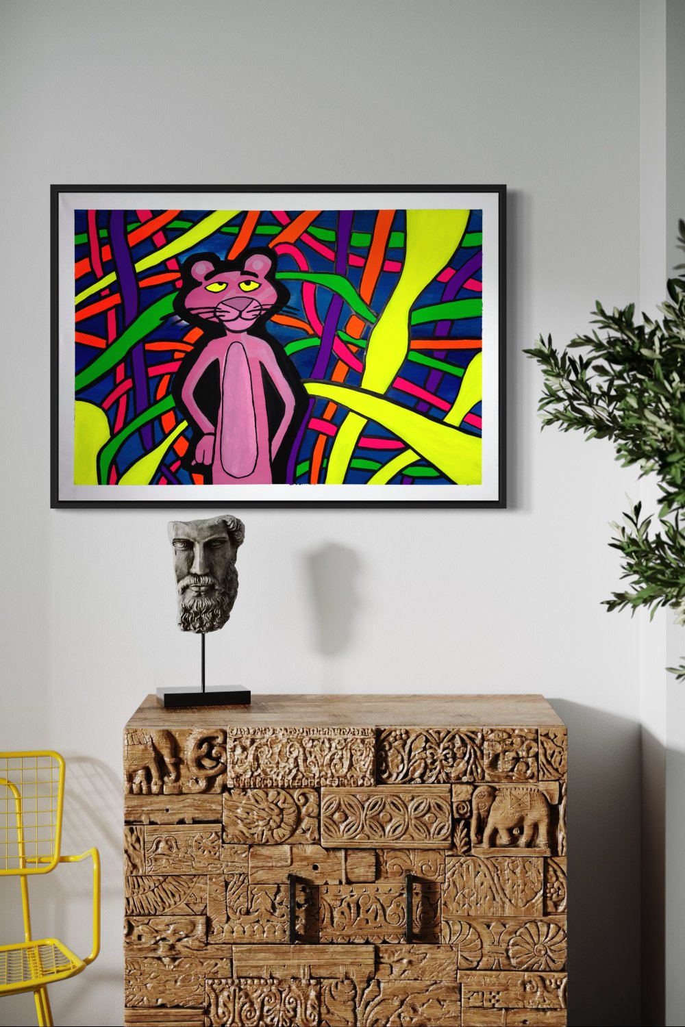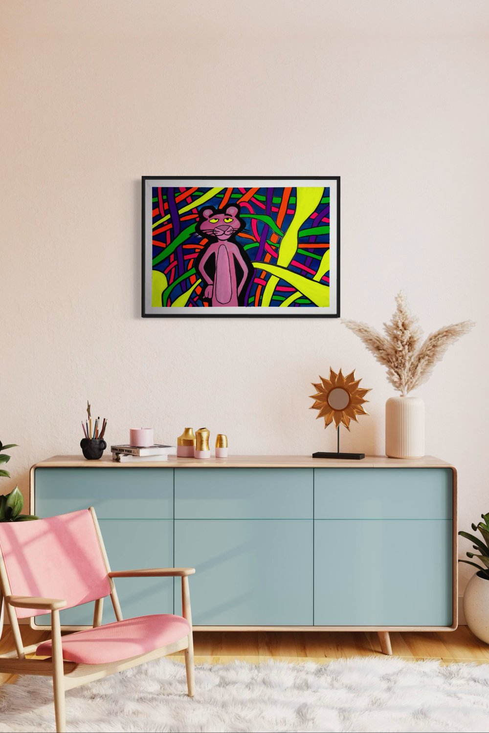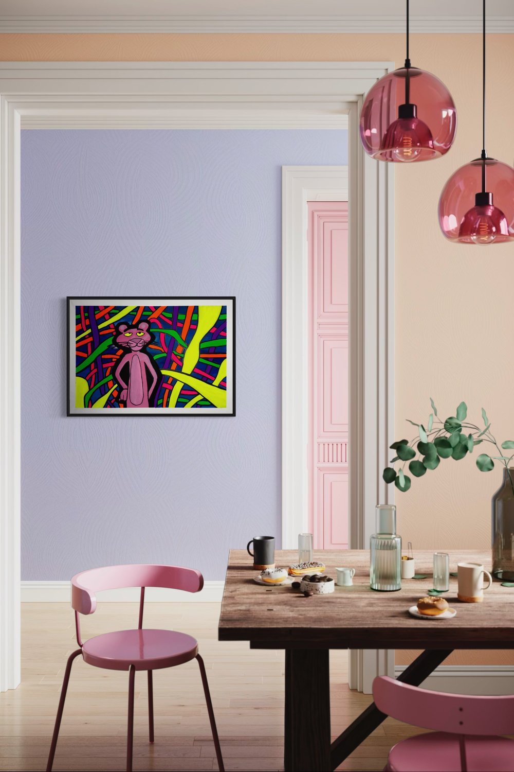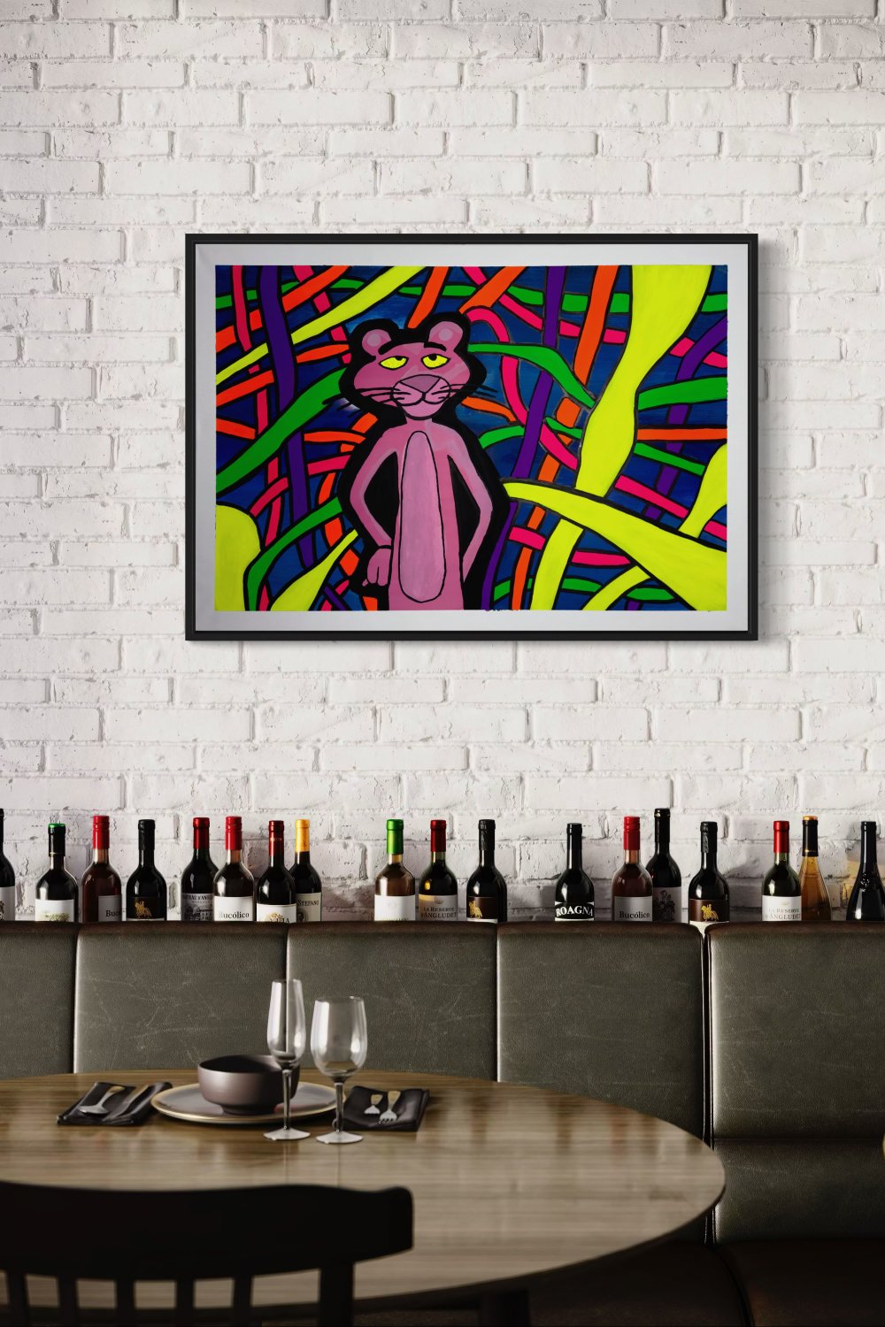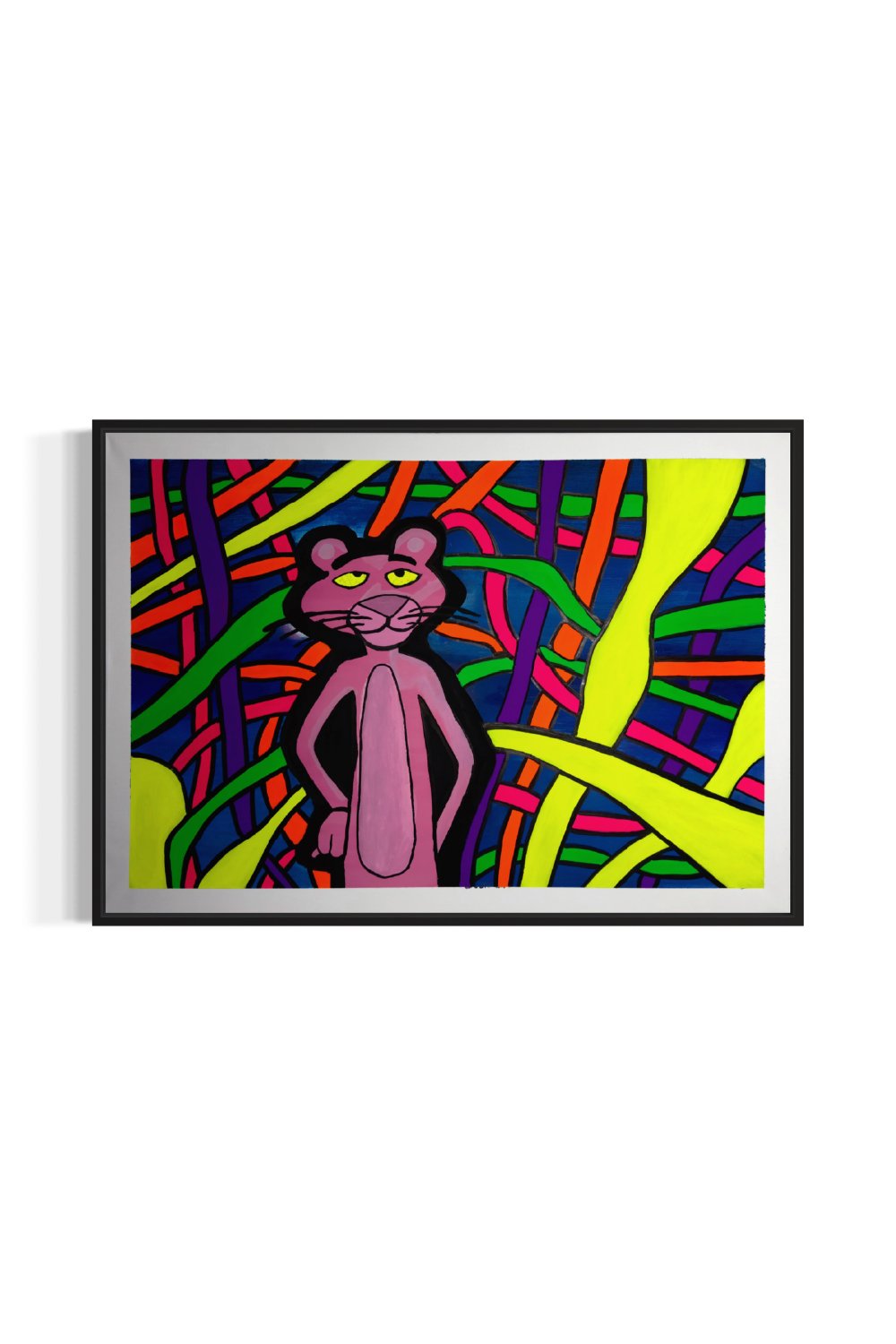 Kaos ve denge iç içe. Pembe Panter, içinde bulunduğu karmaşık ama uyumlu dünyada kendi yolunu bulmaya çalışıyor. Renklerin enerjisi ve soyut çizgilerin akışı, kaosun içinde düzen arayan ruhu temsil ediyor. Bu çalışma, UV ışık altında farklı bir boyut kazanarak geceyle birlikte bambaşka bir hikâye anlatıyor.