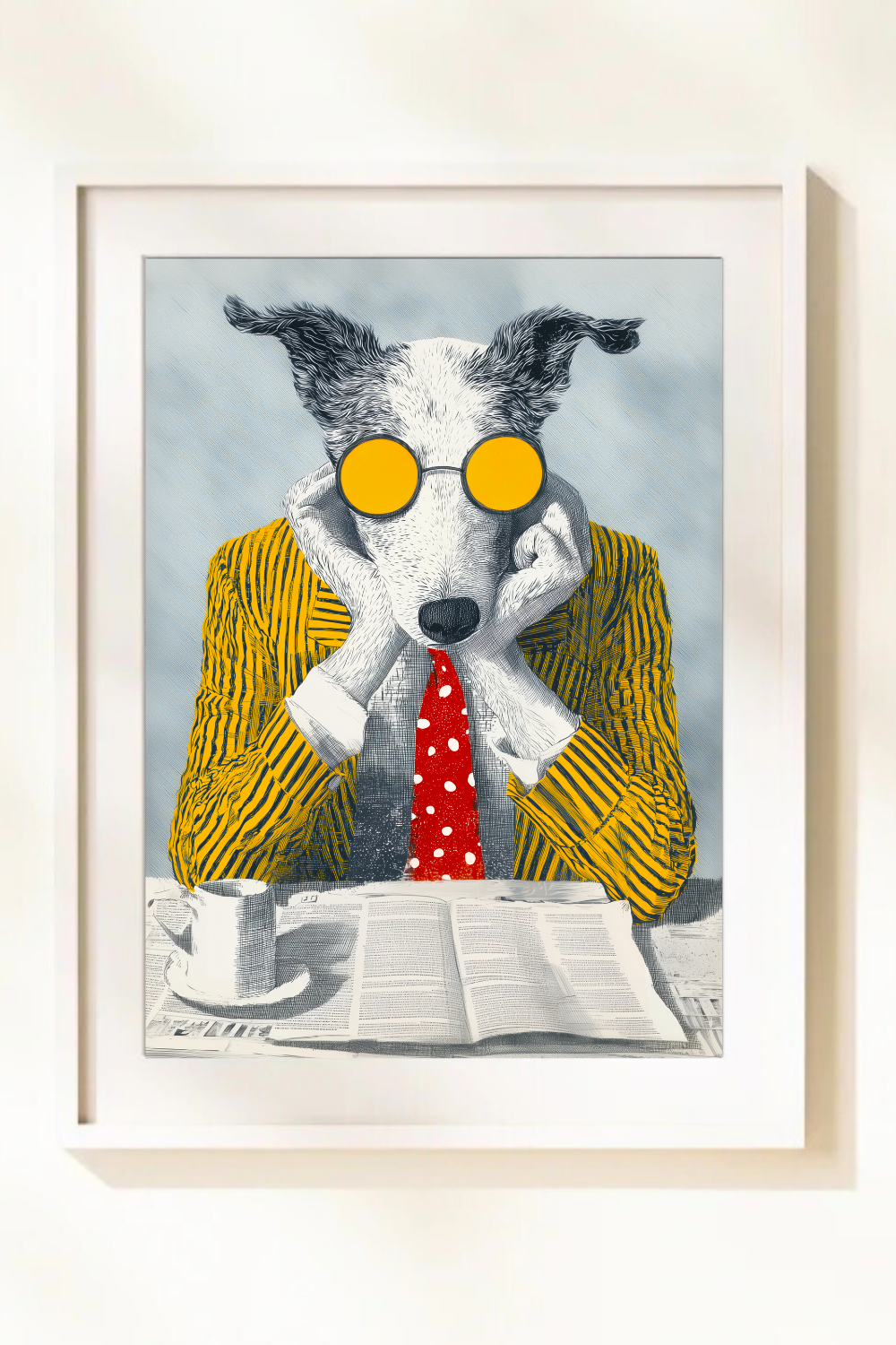 Bir Sabah KlasiğiGözlükler takıldı, kahve hazır, gazete açıldı. Güne başlamanın en cool hali.Görsel mizahın, renkli ironinin ve sessiz bir başkaldırının posteri.Her sabah kendiyle aynı masaya oturan biri varsa, işte o sensin.