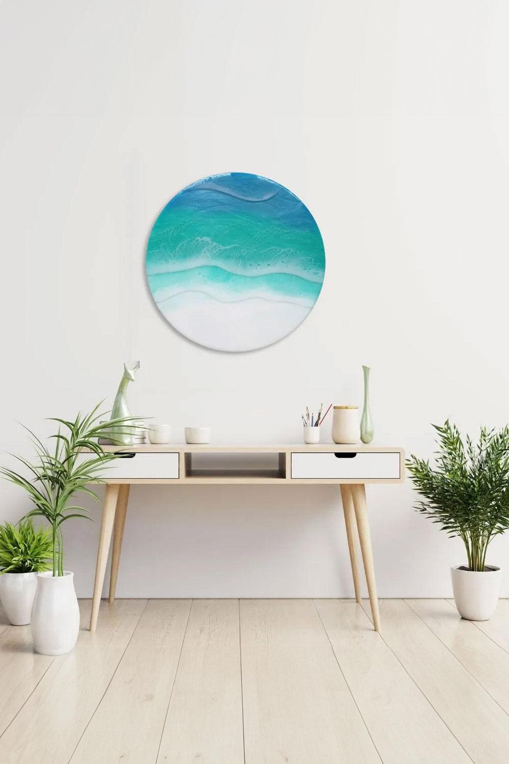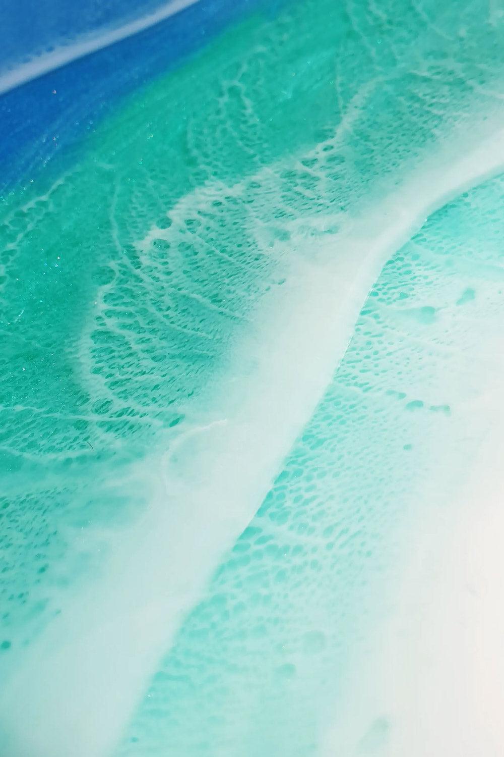- Ahşap zemin üzerine akrilik boyama, 3 katmanlı reçine dalgası.