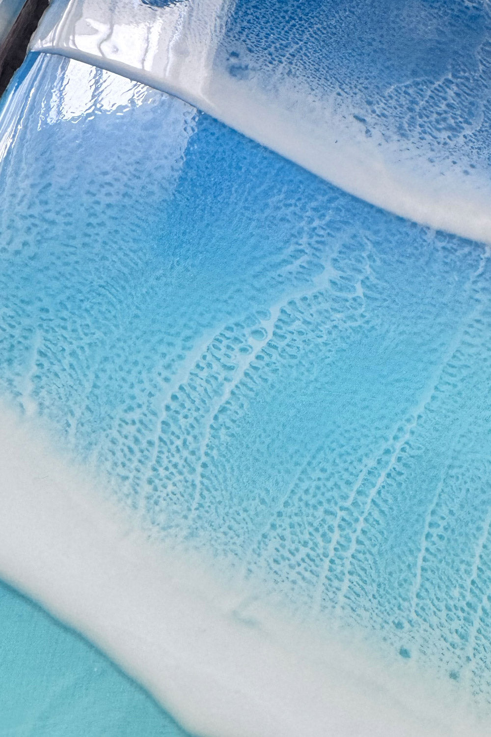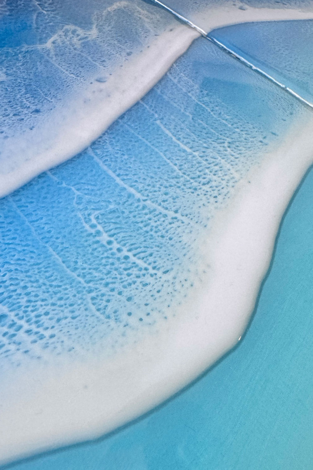 Epoksi, çalışması zor ama bir o kadar da eğlenceli bir malzeme. Denizin eşsiz mavi ve turkuaz tonlarıyla renklendirilince hepsi birbirinden farklı ve benzersiz eserler ortaya çıkıyor. Malzemenin yapısı dolayısıyla ortaya çıkan yansımalar deniz etkisini güçlendiriyor. Her yeni bir çalışmaya başlarken, sonunda sizi nereye götüreceğini tahmin etmek mümkün olmuyor. Bu da her parçanın benzersiz olmasını sağlıyor.