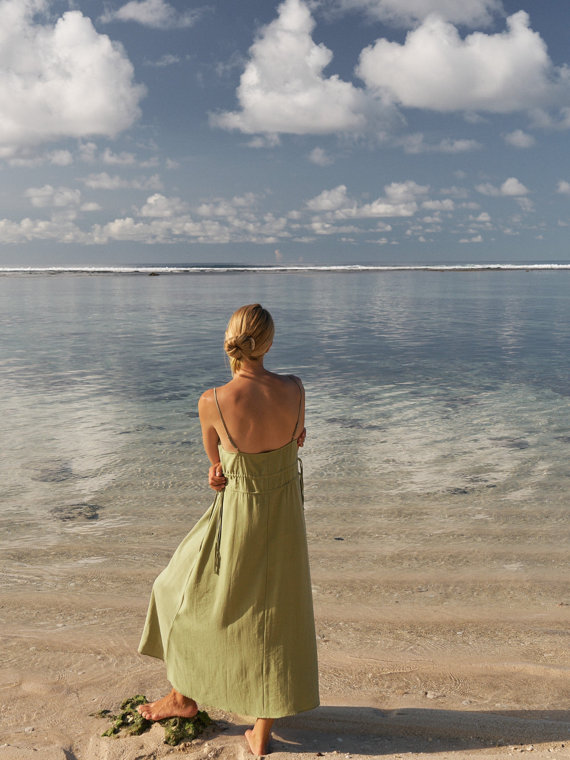 Bu maxi elbise, rahat silueti ve akıcı hareketiyle zahmetsiz şıklığı temsil eder. Derin V yaka ve ince omuz askıları zarif bir feminen dokunuş yaratırken, yanlardaki ayarlanabilir bağcık detayları kişisel bir uyum sağlar. Çok yönlülük için tasarlanmış bu elbise, gündüzden geceye sorunsuz bir şekilde geçiş yaparak her dolabın vazgeçilmezi olur.