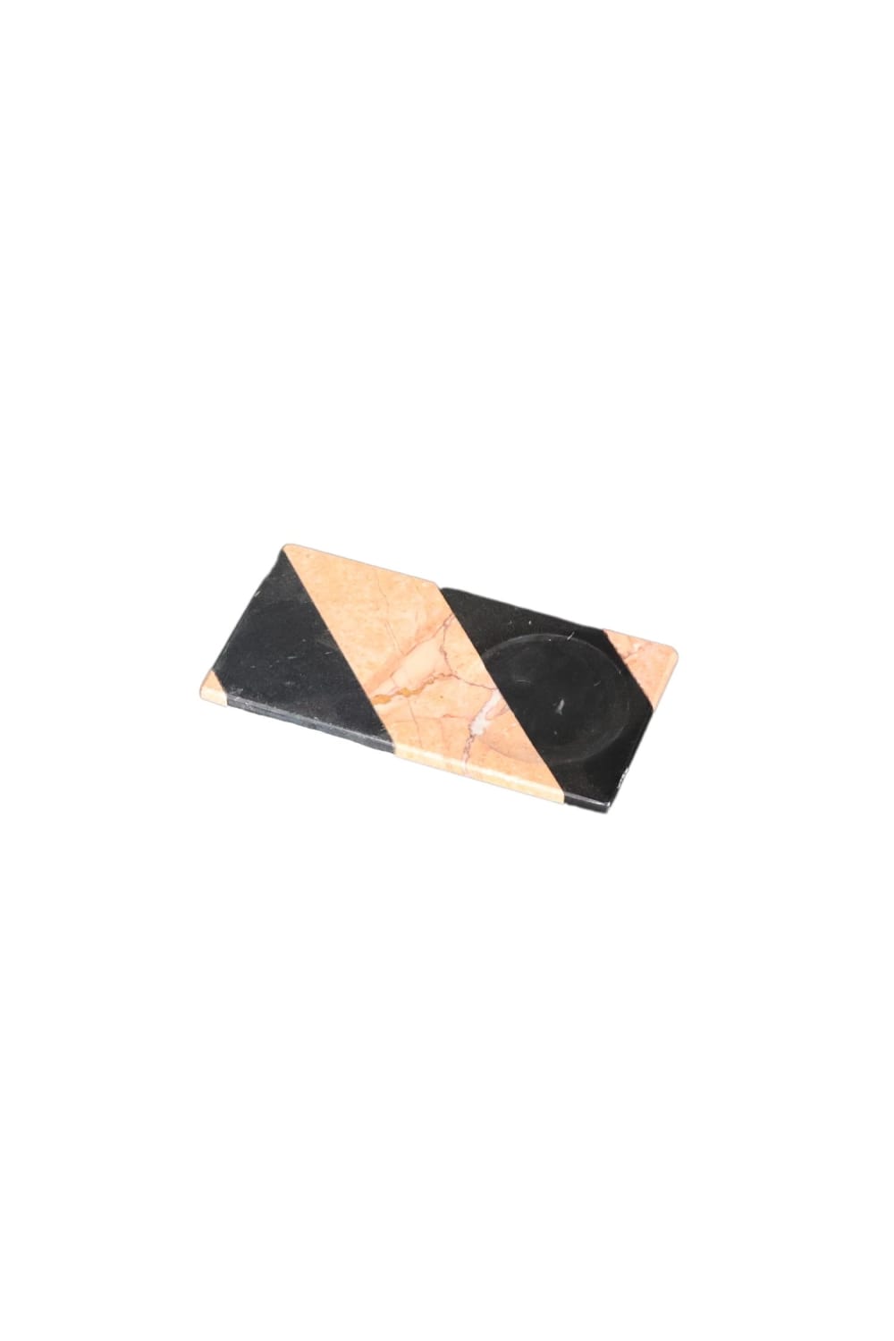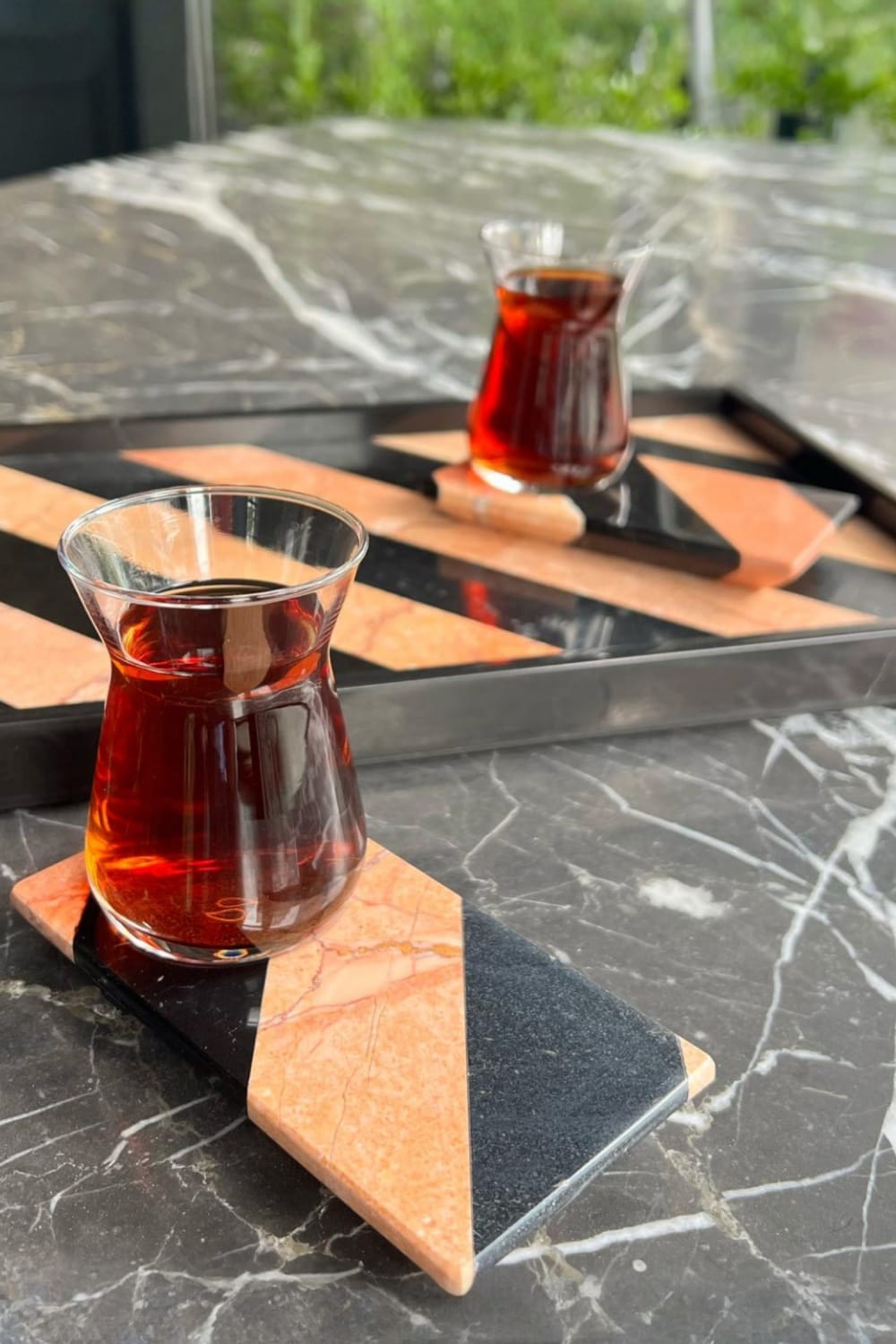 El yapımı çift renk mermer çay bardağı altlığı. Serinin tepsisi de bulunmaktadır. Ölçüler 14x7x1.5 cm.