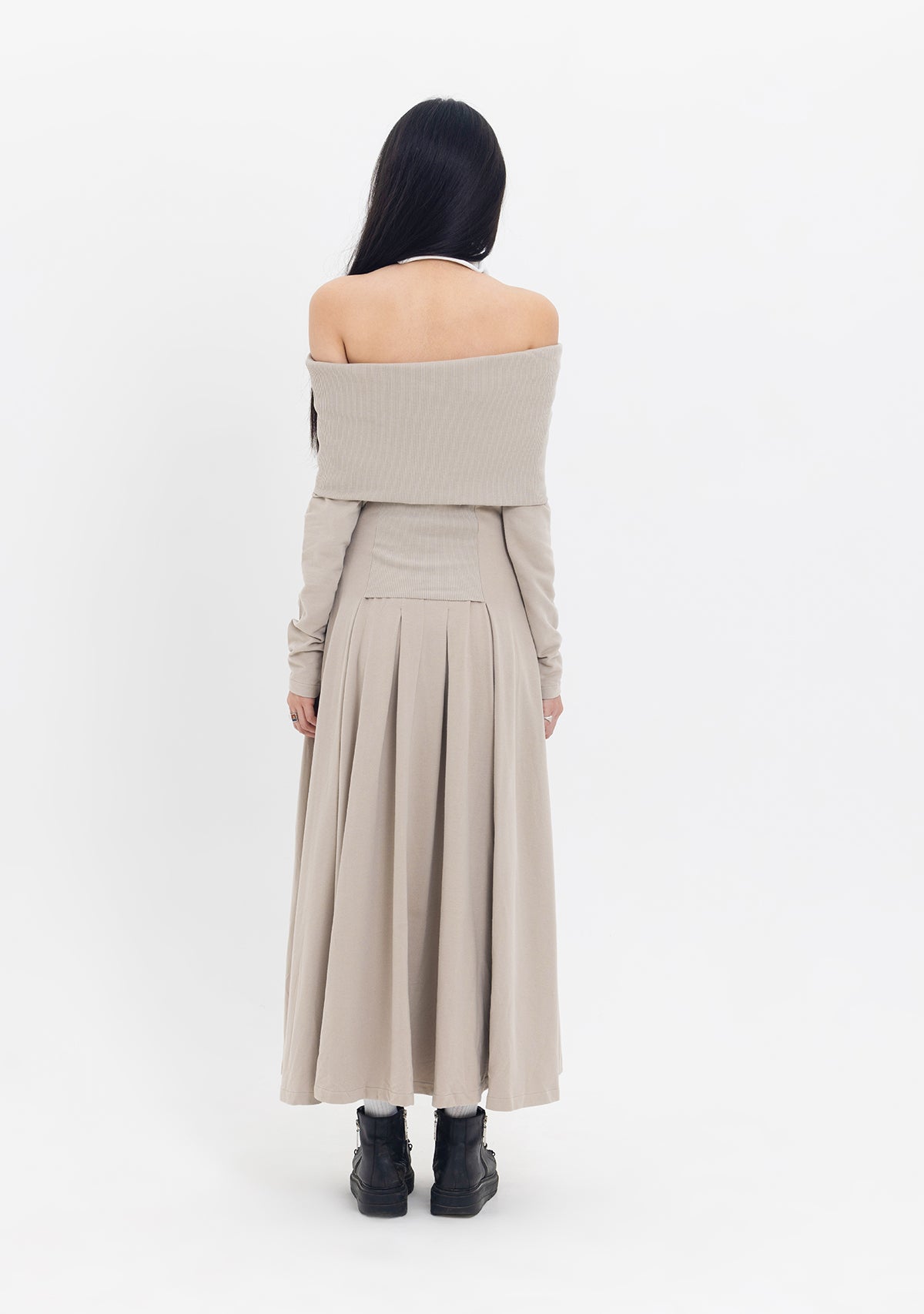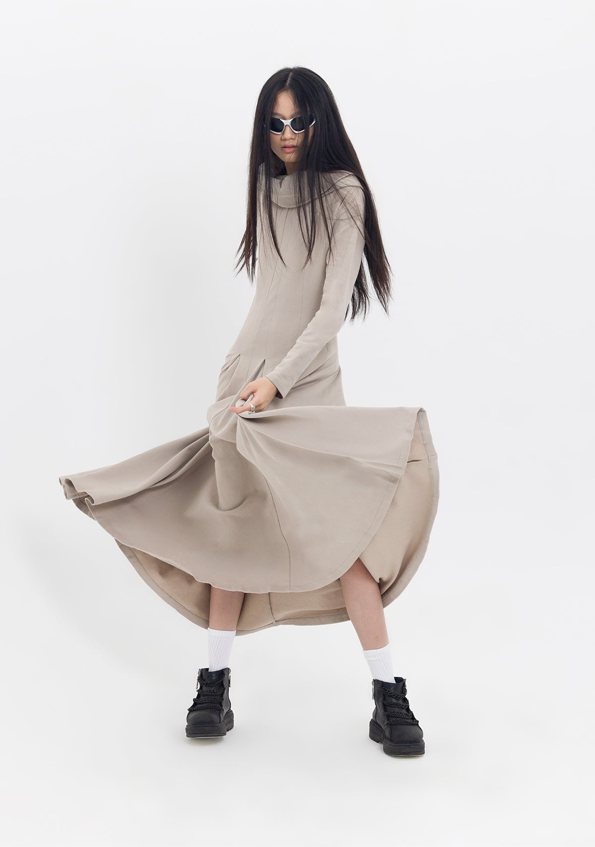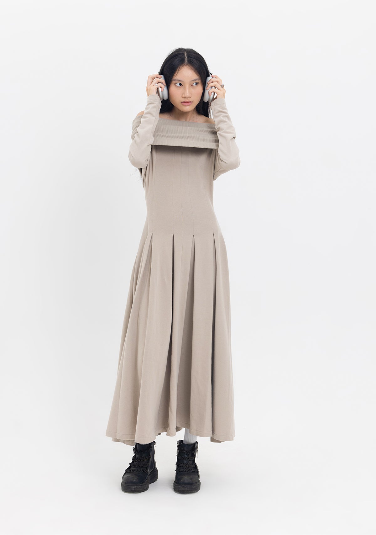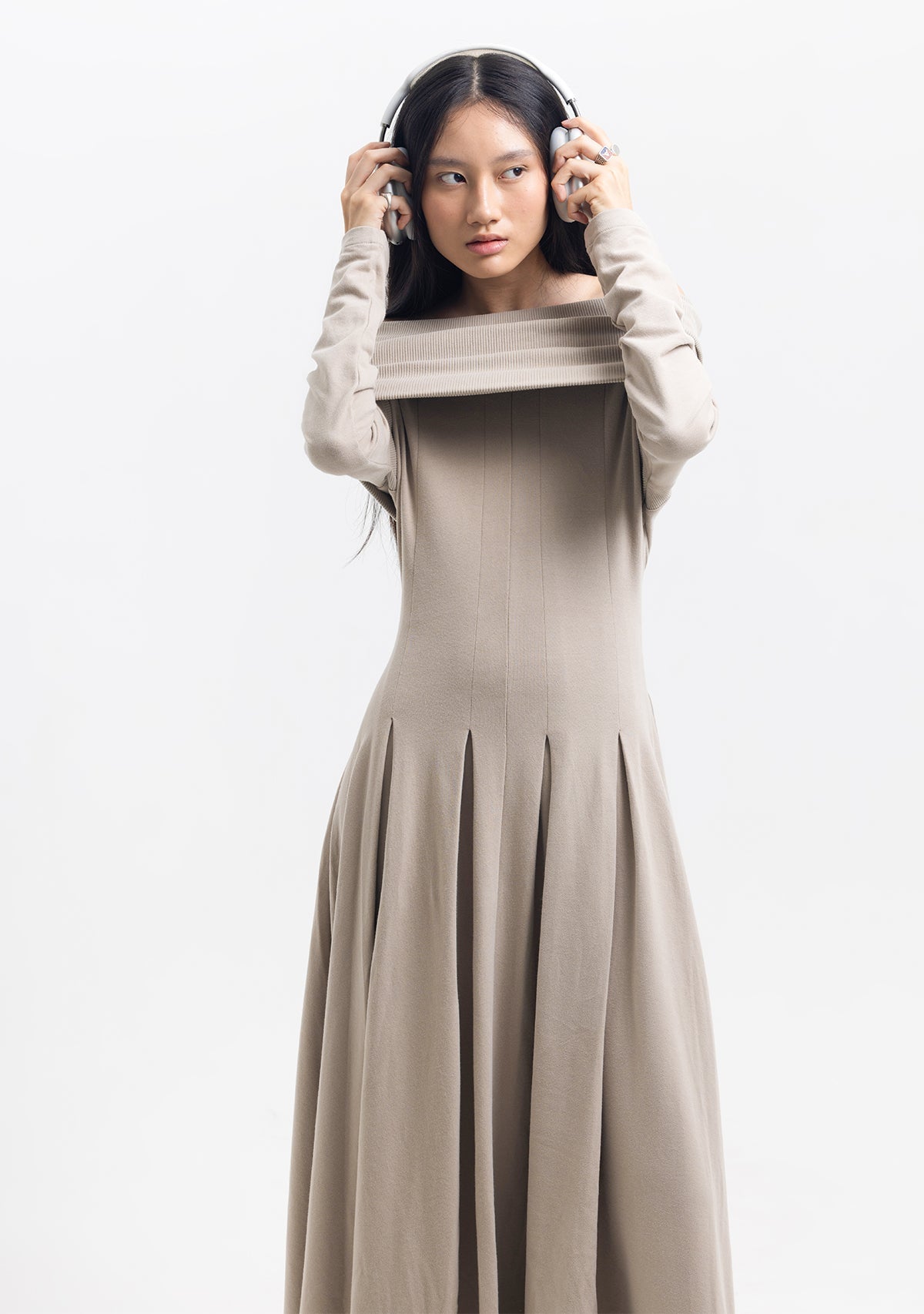 - Tiny x Pcfg iş birliğiyle tasarlanan Kayık Yaka Pileli Bej Uzun Elbise, modern ve zamansız bir şıklık sunan tasarımıyla öne çıkıyor.