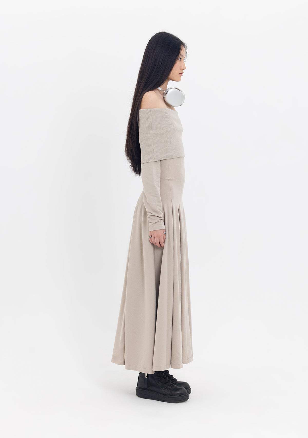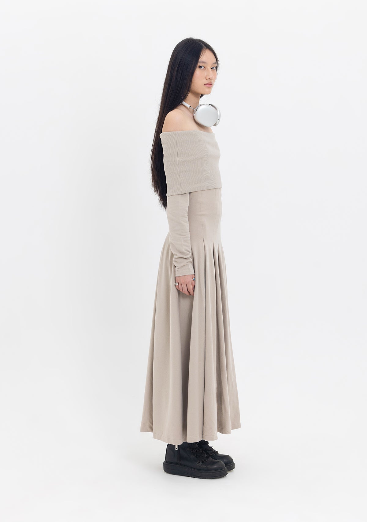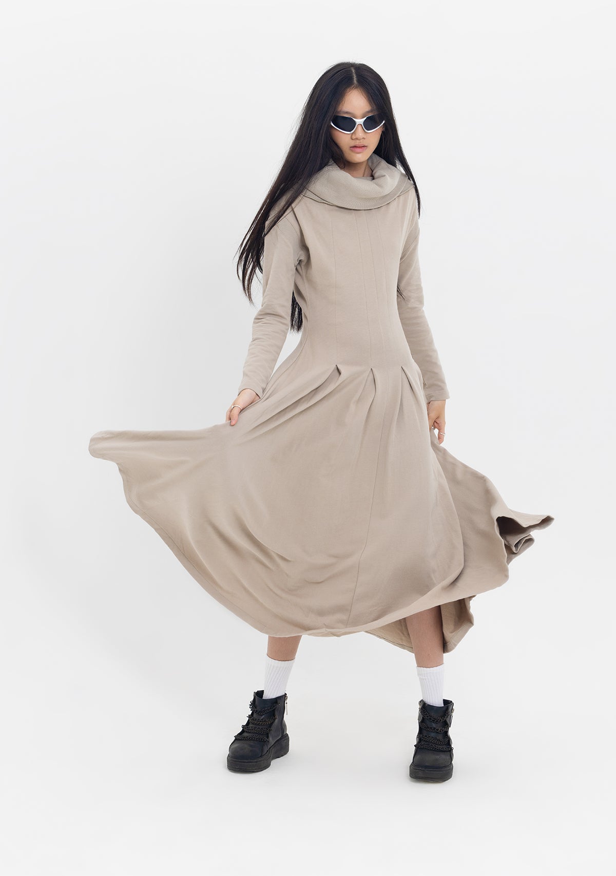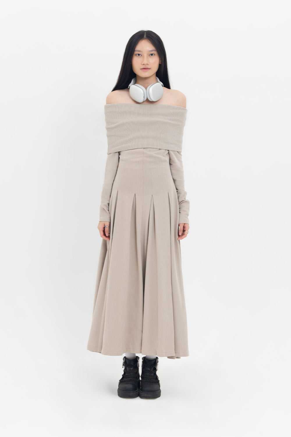 - Tiny x Pcfg iş birliğiyle tasarlanan Kayık Yaka Pileli Bej Uzun Elbise, modern ve zamansız bir şıklık sunan tasarımıyla öne çıkıyor.