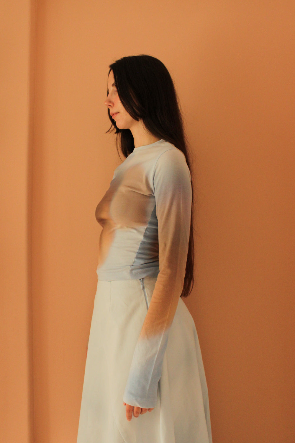 ISOLA Fit Top, vücuda yakın formu ve soyut renk geçişleriyle koleksiyonun modern ve güçlü parçalarından biri. Mavi zemin üzerine kahverengi tonların organik şekilde karıştığı yüzey, her ürünü benzersiz kılan elde boyama tekniğiyle tamamlanıyor. Hem günlük stile hem katmanlı görünümlere kolayca uyum sağlar.