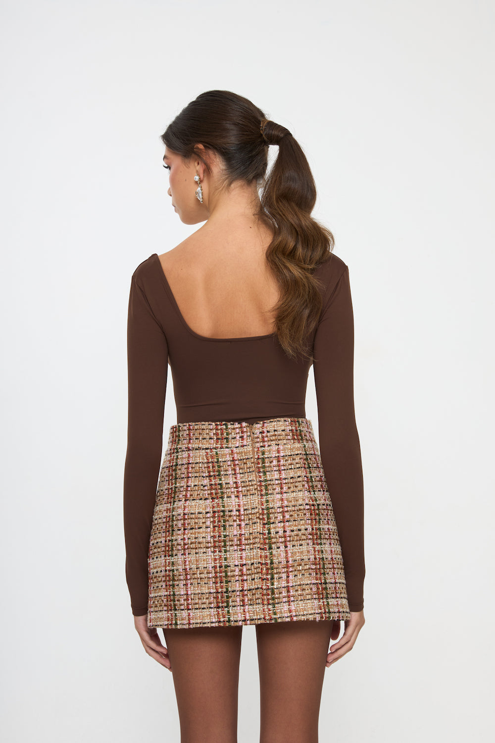 Klasik Parisian şıklığını modern bir silüetle buluşturan bu tüvit mini etek, zarif dokusuyla stilinizin odak noktası olmaya hazır. Krem, kahve ve pastel dokunuşlarla zenginleştirilmiş çok renkli Chanel tarzı kumaşı, hem sıcak hem de sofistike bir görünüm sunar. Yüksek bel formu, bacak boyunu optik olarak uzatırken kusursuz dikimiyle vücuda oturur ve feminen bir duruş yaratır.