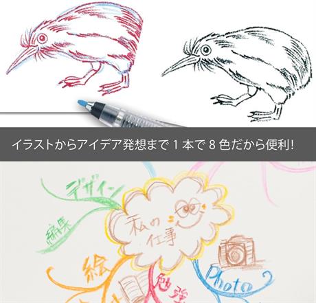 Kalemin sağlam ve şeffaf plastik gövdesi, uçların renklerini kolayca görmenizi sağlar. Renk değiştirmek için gövdenin üst kısmındaki göstergeden istediğiniz rengi seçmeniz yeterlidir. İçinde kırmızı, mavi, yeşil, kahverengi, turuncu, açık yeşil, sarı ve pembe olmak üzere toplam 8 renkli uç bulunur. Renkli uçlar kurşun kalem gibi çizim yapabilir ve gerektiğinde silinebilir.