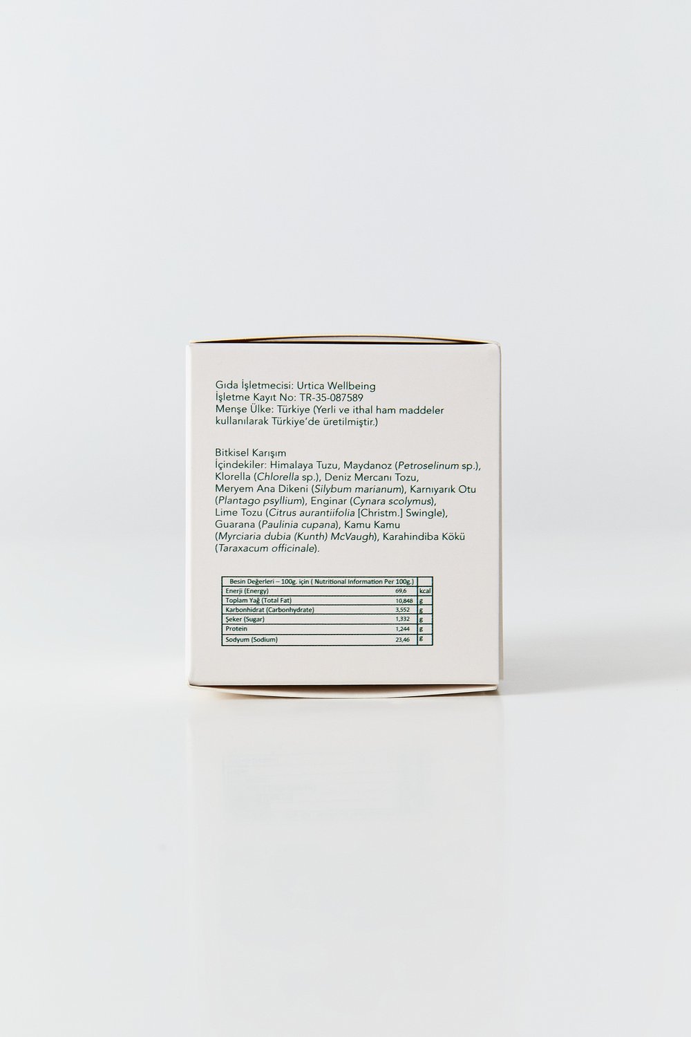Sal del Himalaya, Clorella, Coral marino en polvo, Cardo de la Virgen María, Hierba de maíz, Lima en polvo, Alcachofa, Perejil, Guaraná, Kamu Kamu, Raíz de diente de león