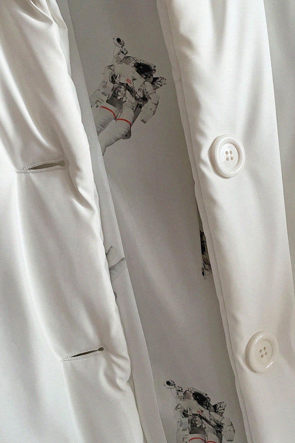 Cloud Coat ofrece una apariencia minimalista con sus cuellos en forma de nubes y su color blanco. La tranquilidad y suavidad del tejido mate hace referencia a la estructura en forma de nube, mientras que los astronautas de su forro te acompañan en tus viajes.