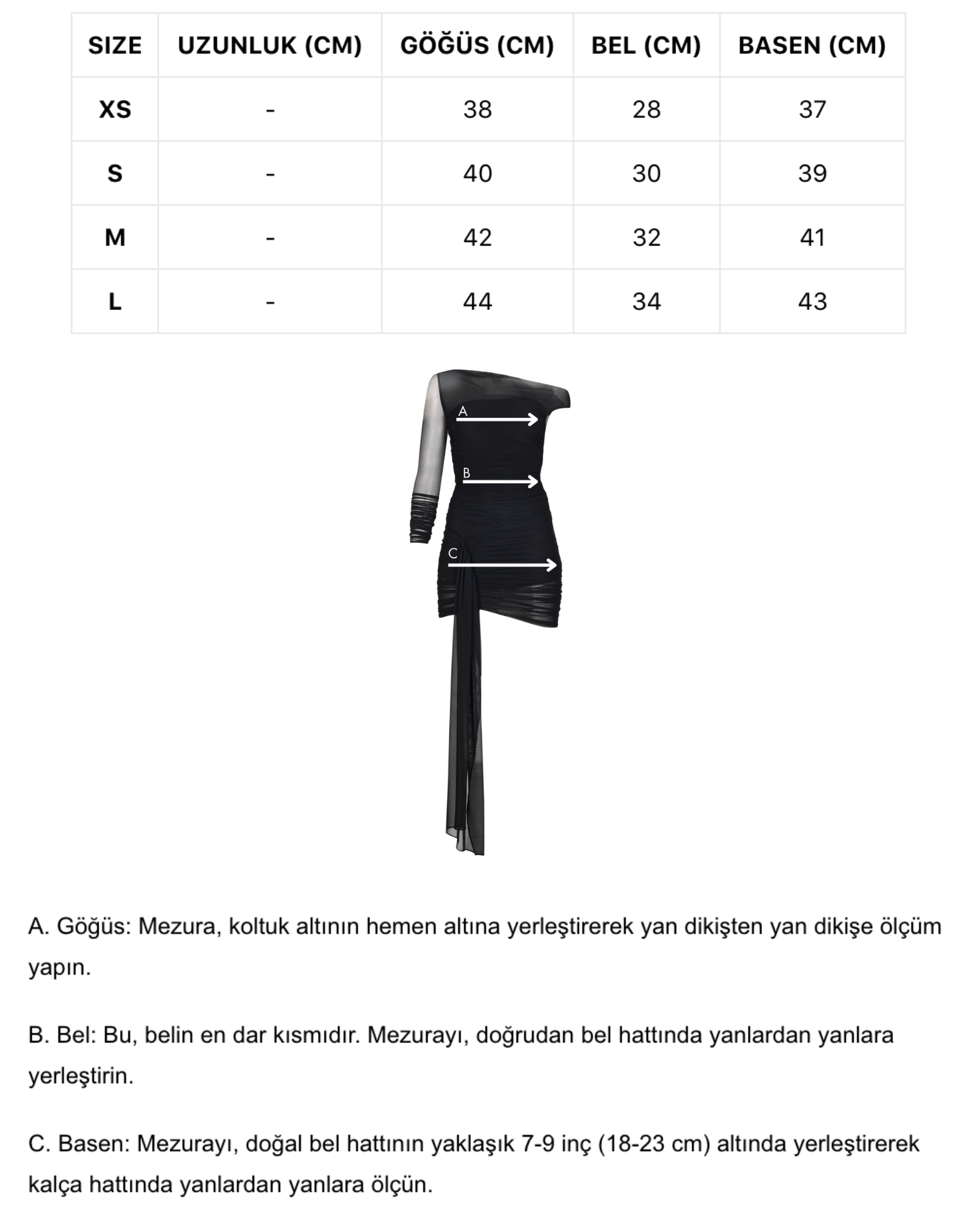 XS: Göğüs 78–82 / Bel 60–64 / Basen 86–90