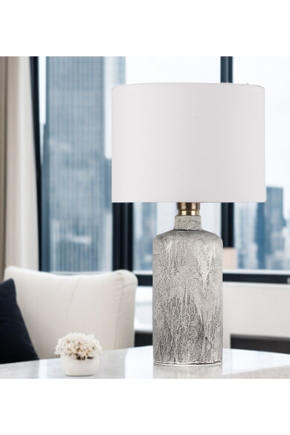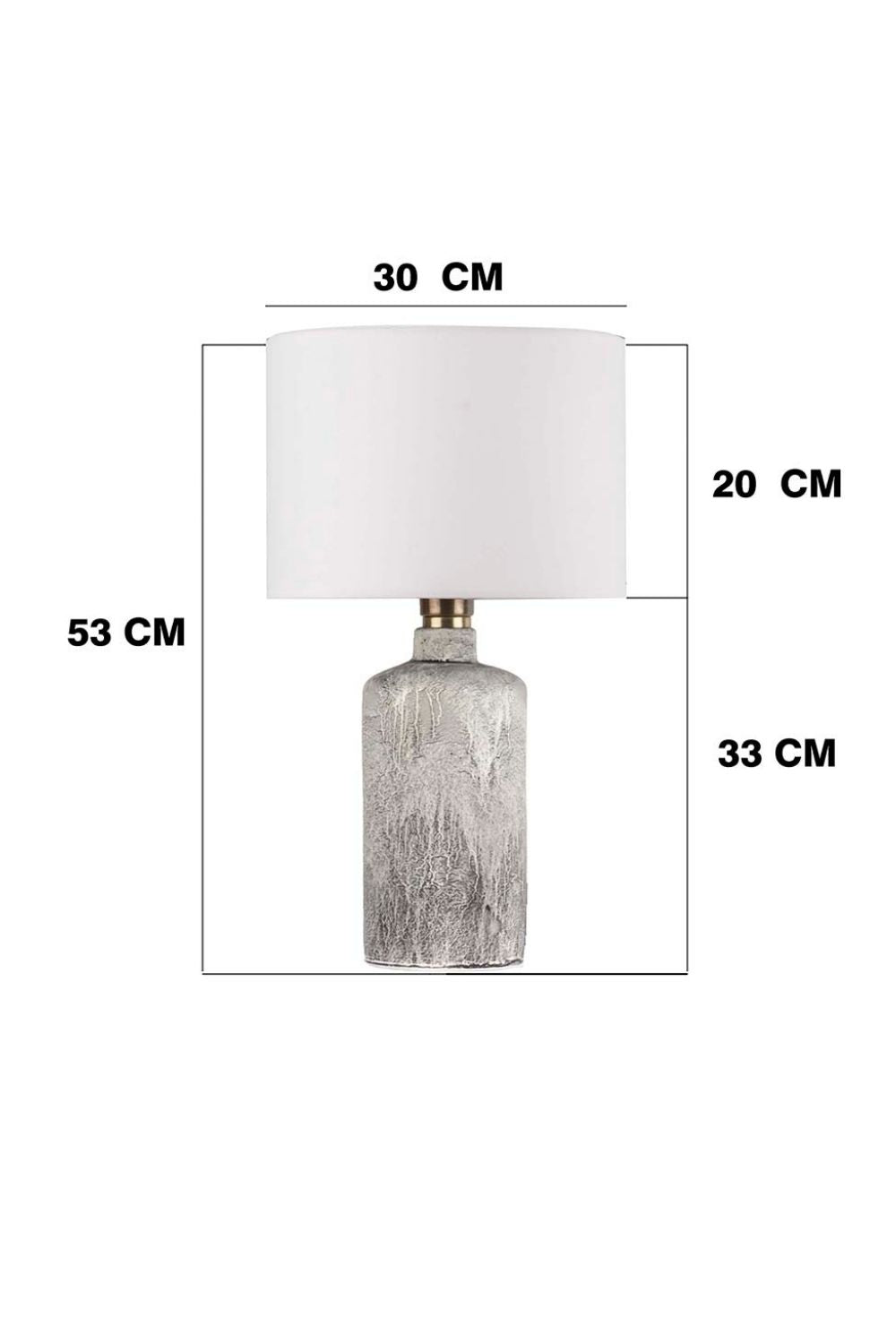 El yapımı seramik gövdesi ve gri tonlarındaki kumaş abajuru ile hem rustik hem