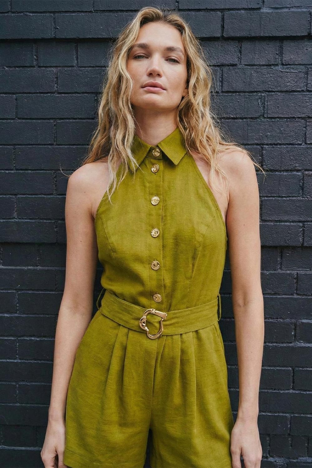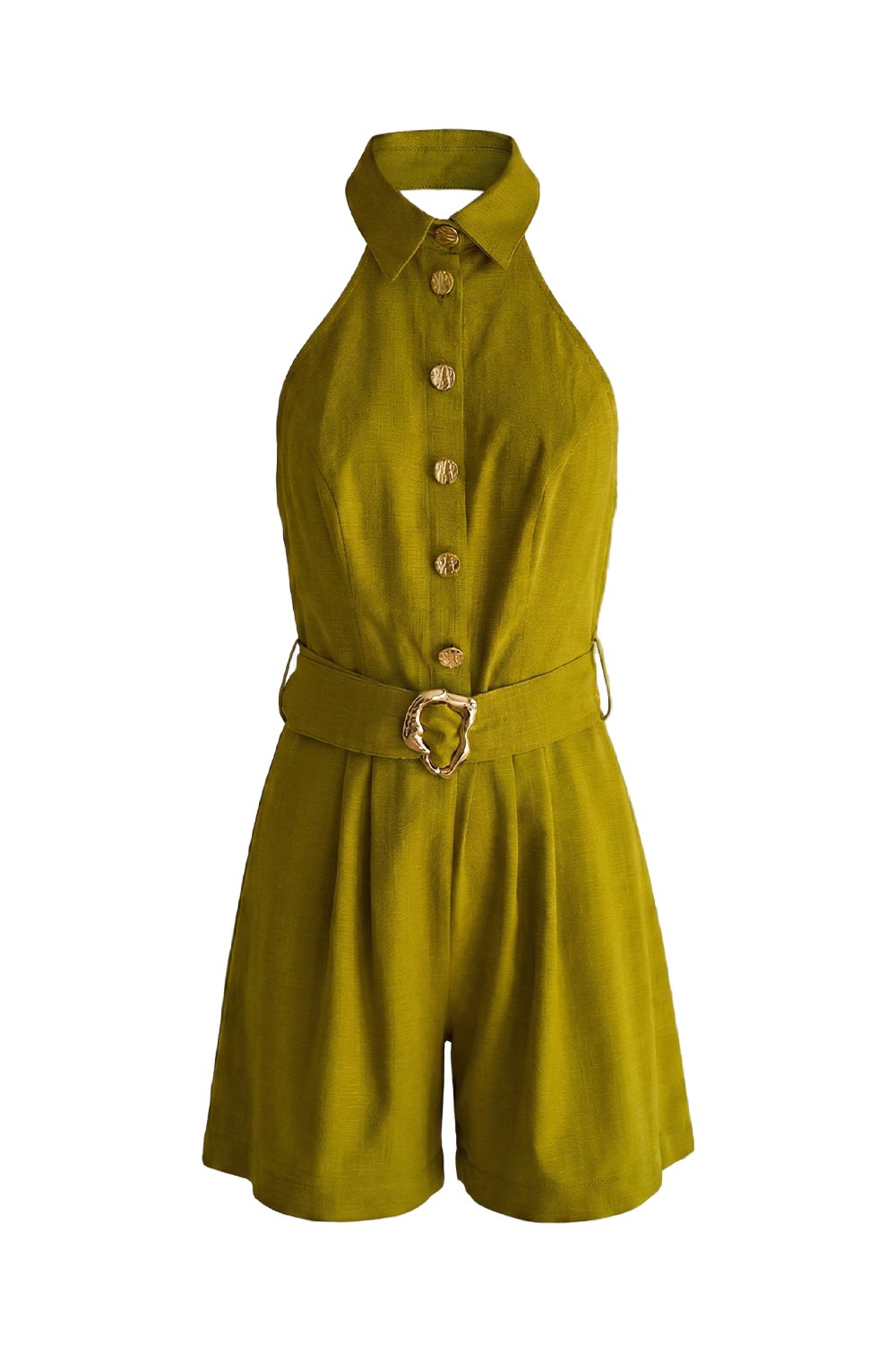 Düğme Detaylı Halter Yaka Şort Tulum Yeşil