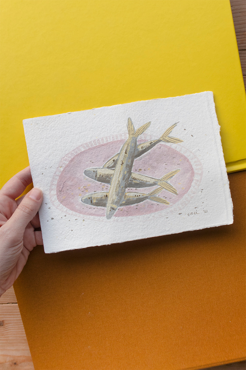 * Geri dönüştürülmüş el yapımı kağıt üzerine guaj resim.