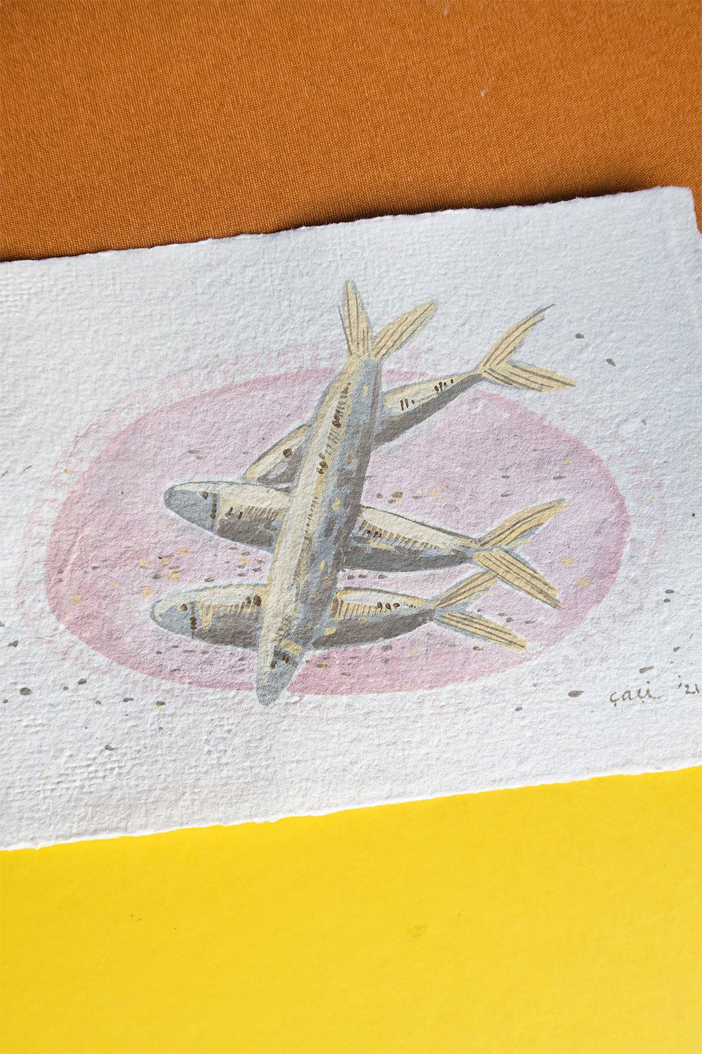 Bu resim kendi ürettiğimiz geri dönüştürülmüş el yapımı kağıt üzerine yapılmıştır. Sürdürülebilir yaratıcılığa olan bağlılığımızı yansıtan çevre dostu bir sanat eseridir.