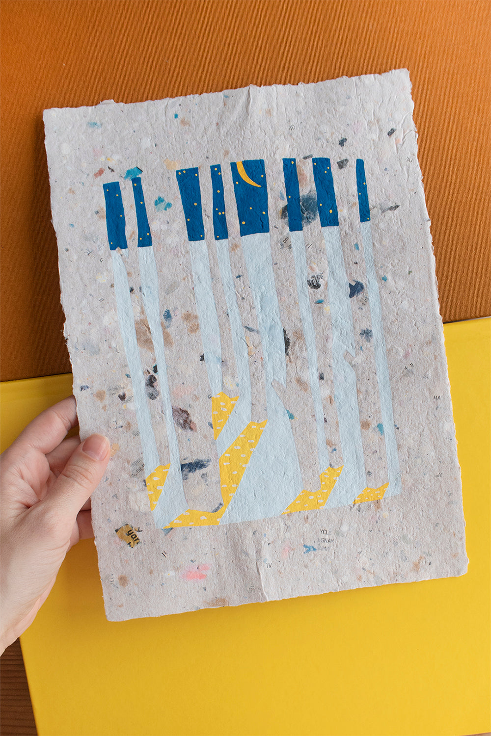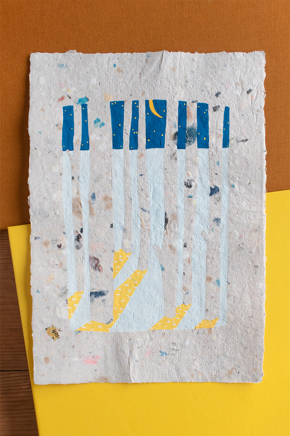 * Geri dönüştürülmüş el yapımı kağıt üzerine guaj resim.
