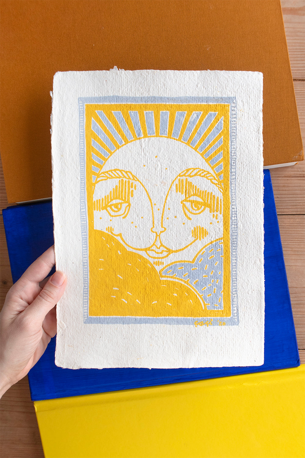 Bu resim kendi ürettiğimiz geri dönüştürülmüş el yapımı kağıt üzerine yapılmıştır. Sürdürülebilir yaratıcılığa olan bağlılığımızı yansıtan çevre dostu bir sanat eseridir.