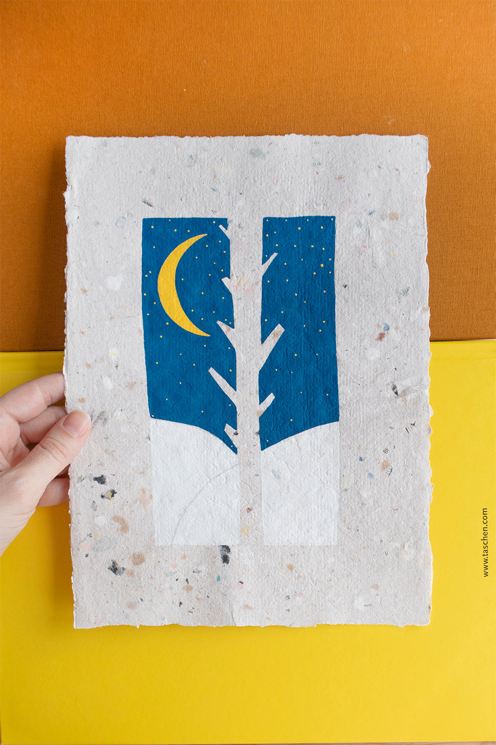 * Geri dönüştürülmüş el yapımı kağıt üzerine guaj resim.