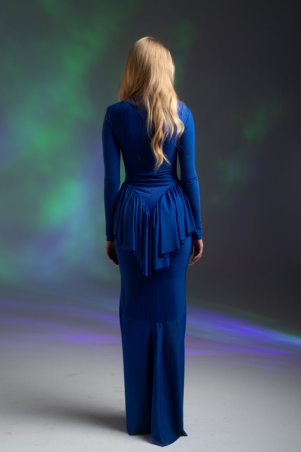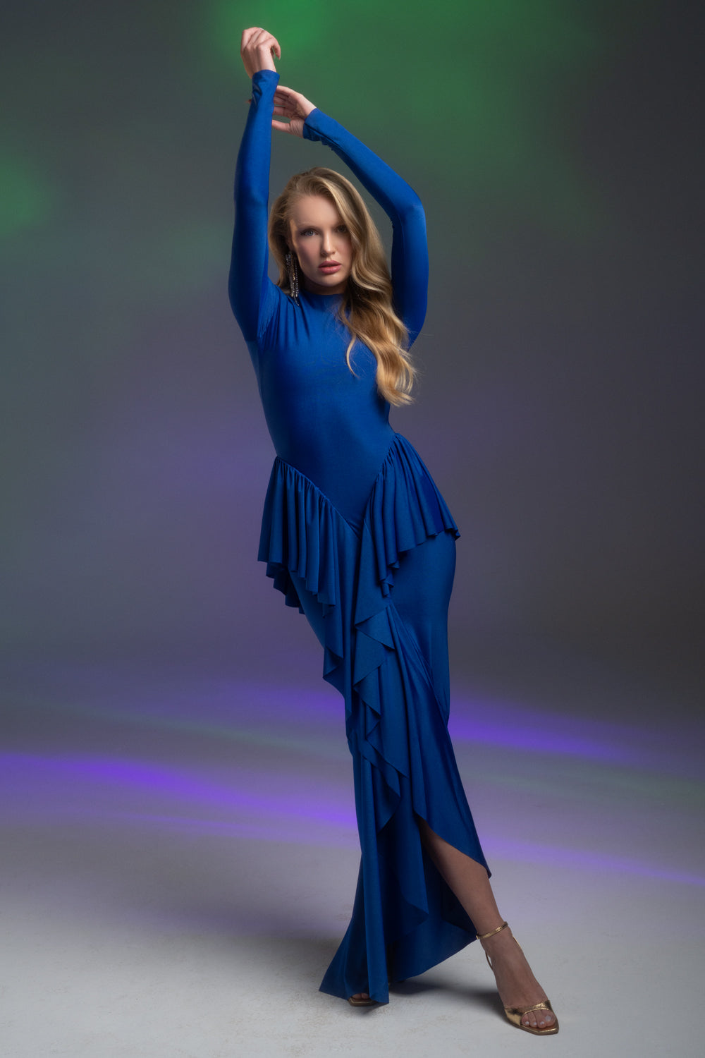 Koyu mavi tonu ve fırfır detaylarıyla zarif ve romantik bir siluet sunar. Likralı dokusu sayesinde vücudu rahatça sarar ve akıcı formuyla özel davetlerde sofistike bir görünüm oluşturur. Yırtmaç detayı hareket özgürlüğü sağlarken feminen bir dokunuş ekler. Uzun kollu yapısı mevsim geçişlerinde kullanımı ideal hale getirir.