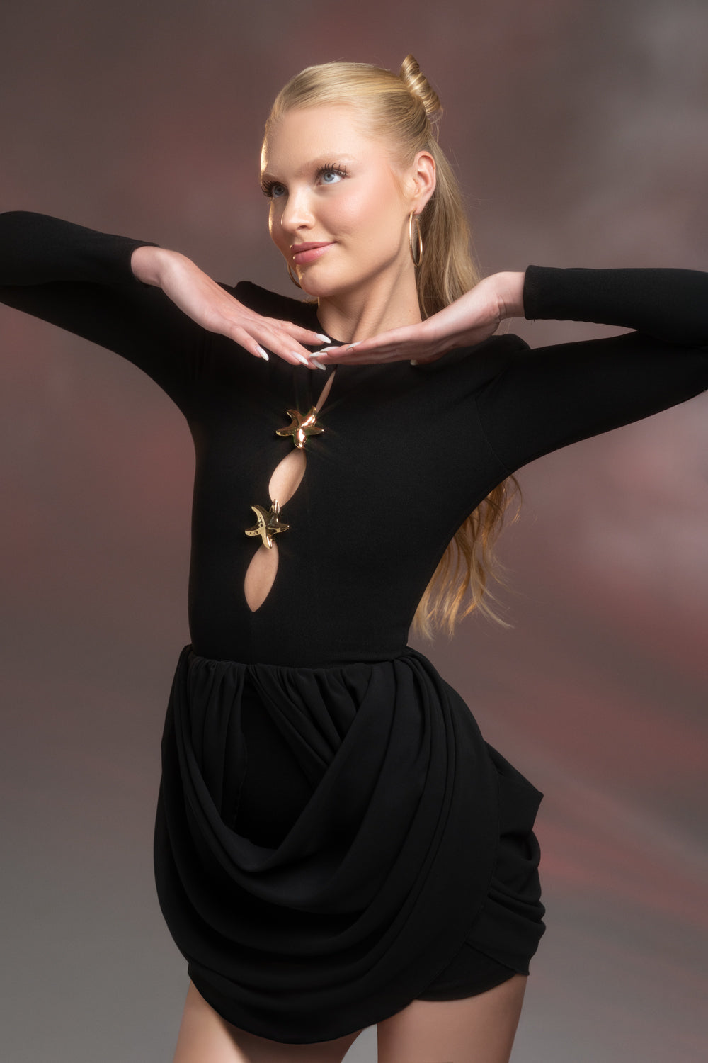 - Şık ve gece etkinlikleri için ideal, siyah yıldız aksesuarlı mini elbise ile göz alıcı bir görünüm elde edin.