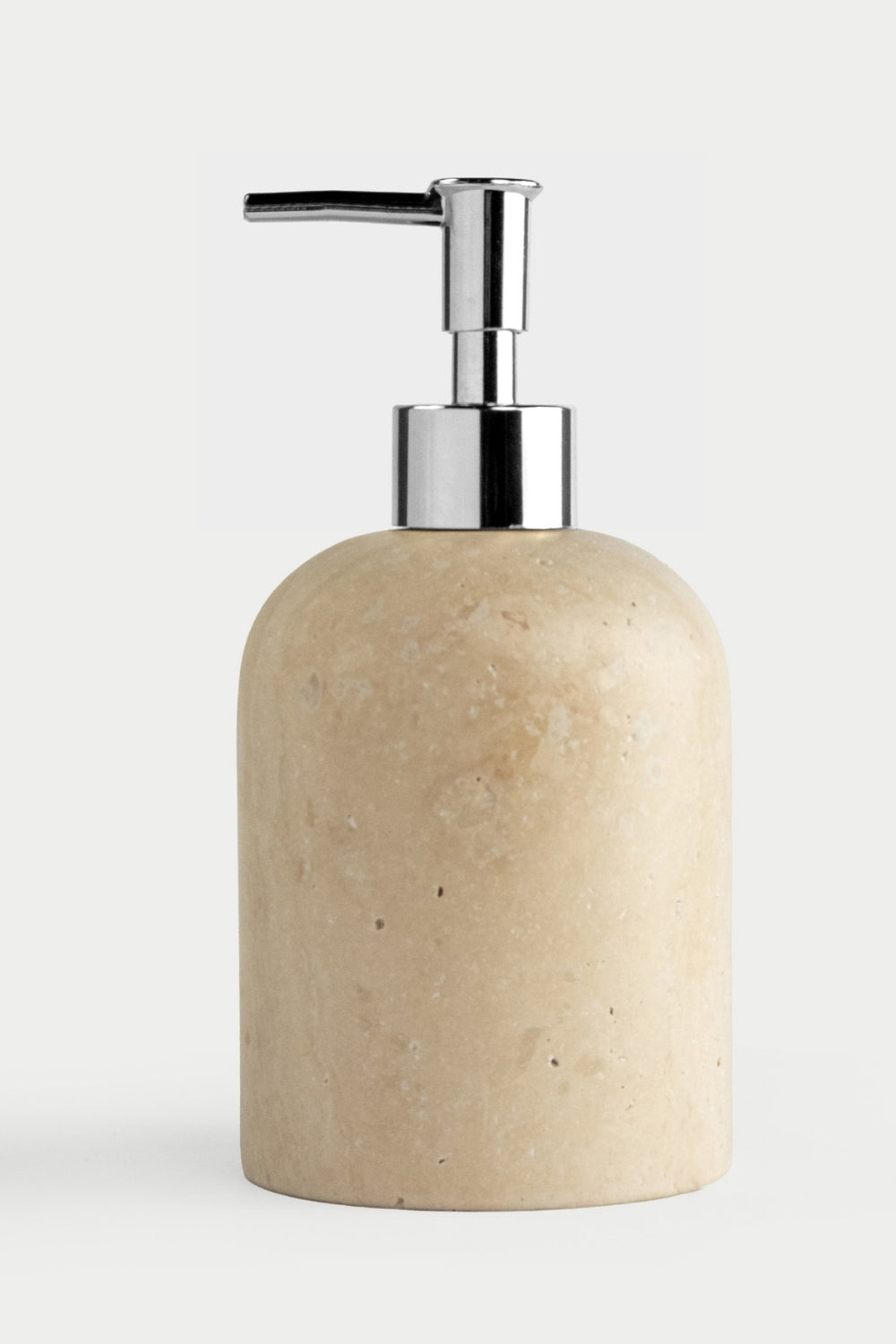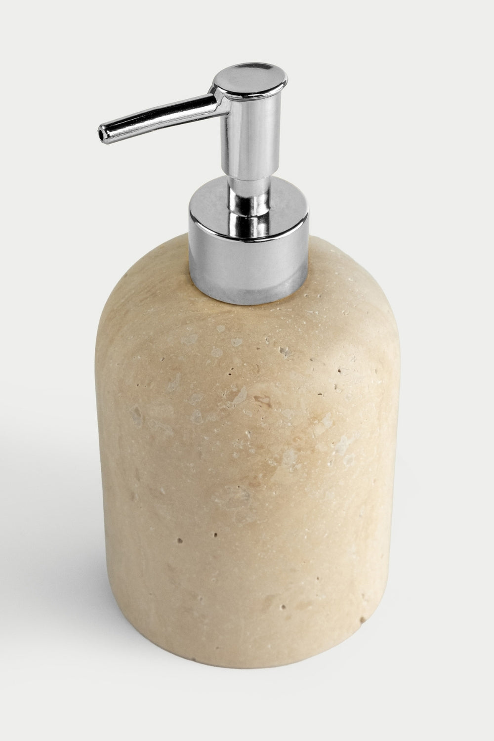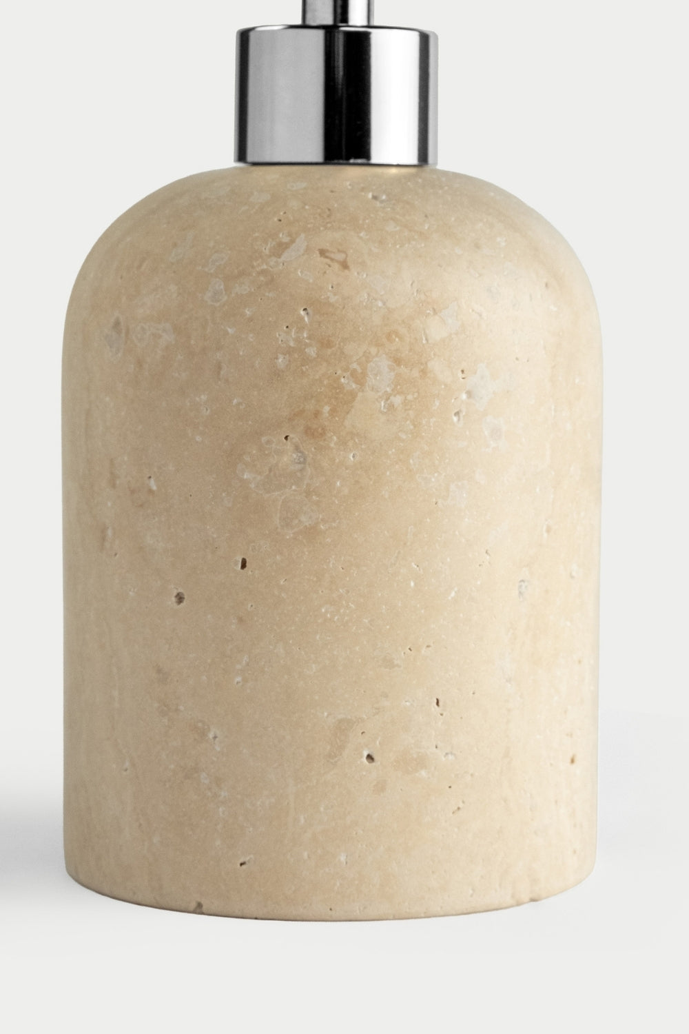Tarz ve İlham:Travertenin doğal, açık bej tonu yüzeyindeki minimal gözenekler, banyo ambiyansına sıcaklık ve organik bir doku katıyor. Silindirik, yumuşak hatlı şişe formu, doğal taşın ağırlığı ve hissi ile birleşerek ürüne kalıcı ve zamansız bir his verir.