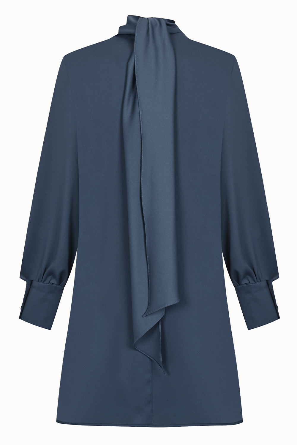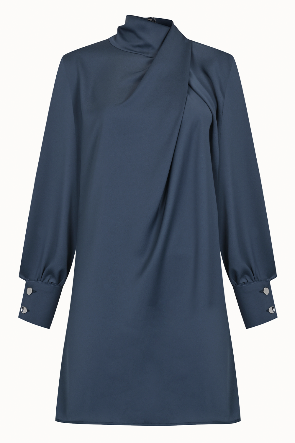 Mat saten kumaştan tasarlanan bu mini elbise, ön kısmındaki drape detayı ve zarif yüksek yakasıyla sofistike bir siluet oluşturuyor. Düğmeli manşetli uzun kolları ve arkadaki zarif fular detayıyla hareket kazanıyor. Akşam davetlerinden özel günlere uzanan zarif bir görünüm için ideal.