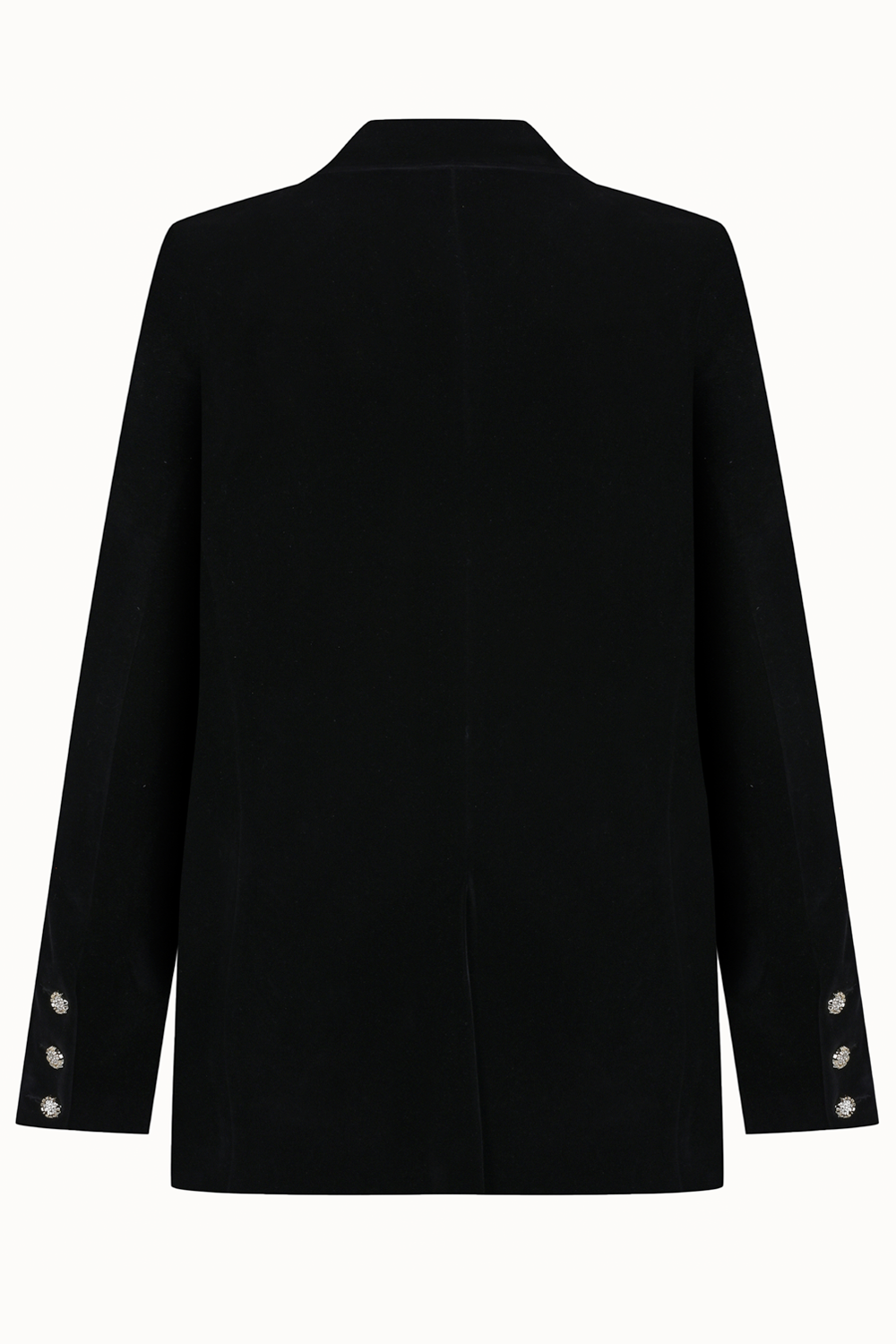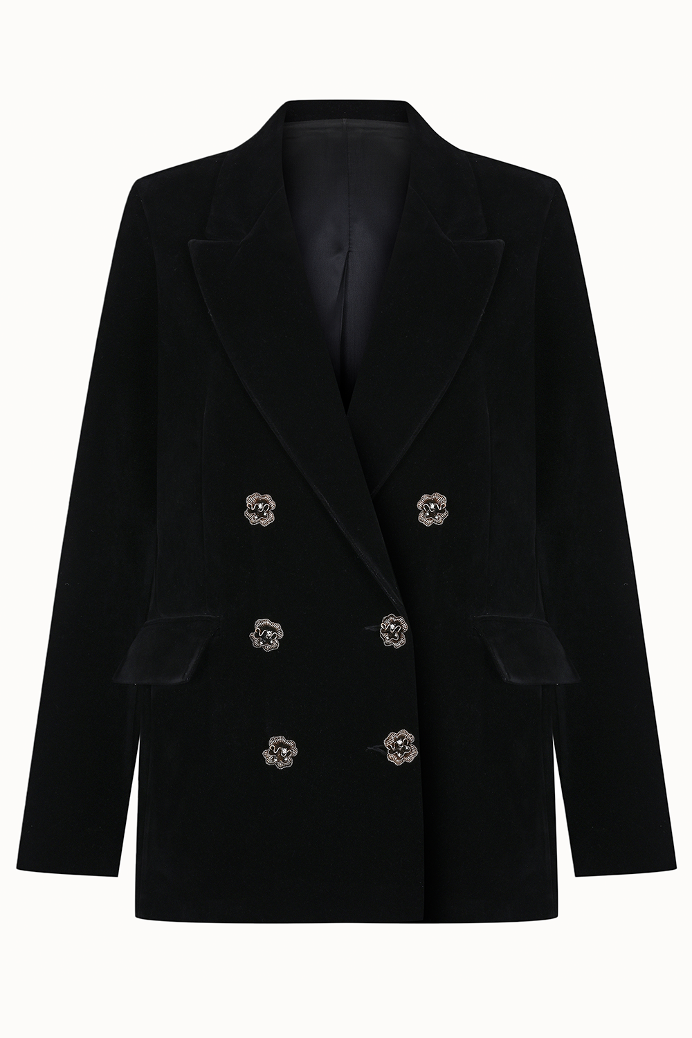 Siyah kadife kumaştan tasarlanan bu çift düğmeli ceket, zarif çiçek formundaki düğmeleri ve keskin formu ile dikkat çekiyor. Geniş yaka detayı ve ön kapaklı cepleriyle hem klasik hem modern bir duruş sunuyor. İster pantolonla ister etek veya elbiseyle kombinlenebilir.