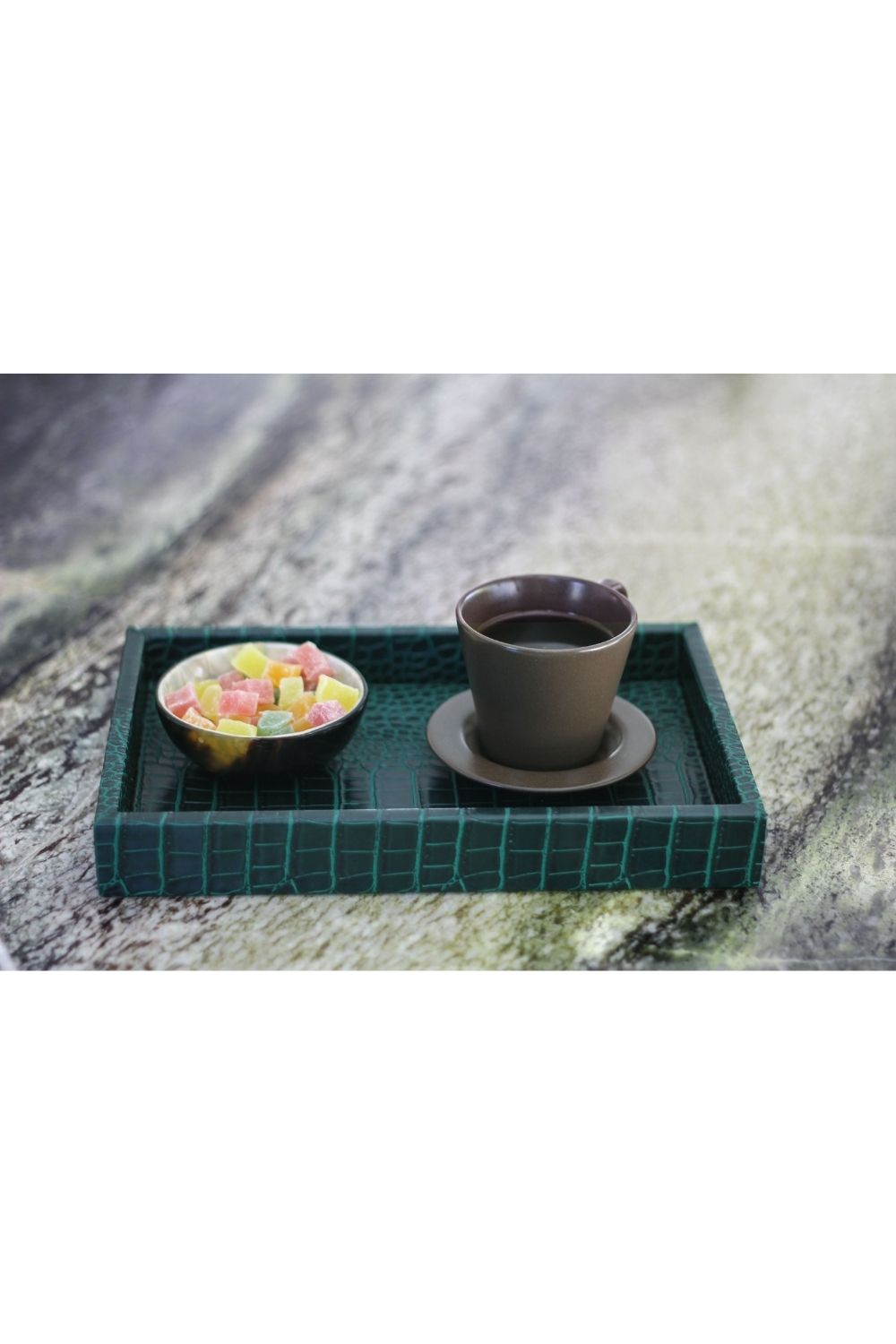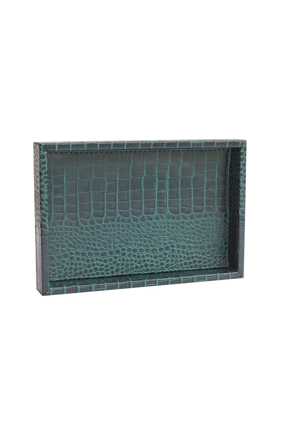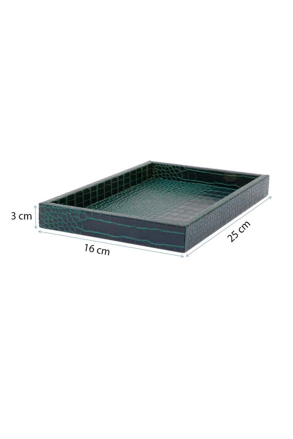 Mat dokusu ve zarif krokodil deseniyle dikkat çeken bu küçük  boy suni deri tepsi, hem dekoratif hem de fonksiyonel bir kullanım sunar. Koyu yeşil tonuyla modern ve sofistike bir görünüm kazanan bu özel tasarım, kaliteli suni deriden üretilmiştir. Sağlam yapısı sayesinde uzun ömürlüdür ve misafir sunumlarında, kahve servislerinde veya konsol üzerinde dekoratif obje olarak şıklıkla kullanılabilir.