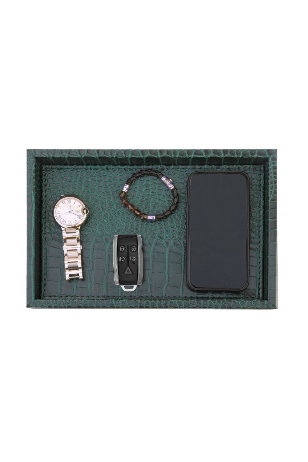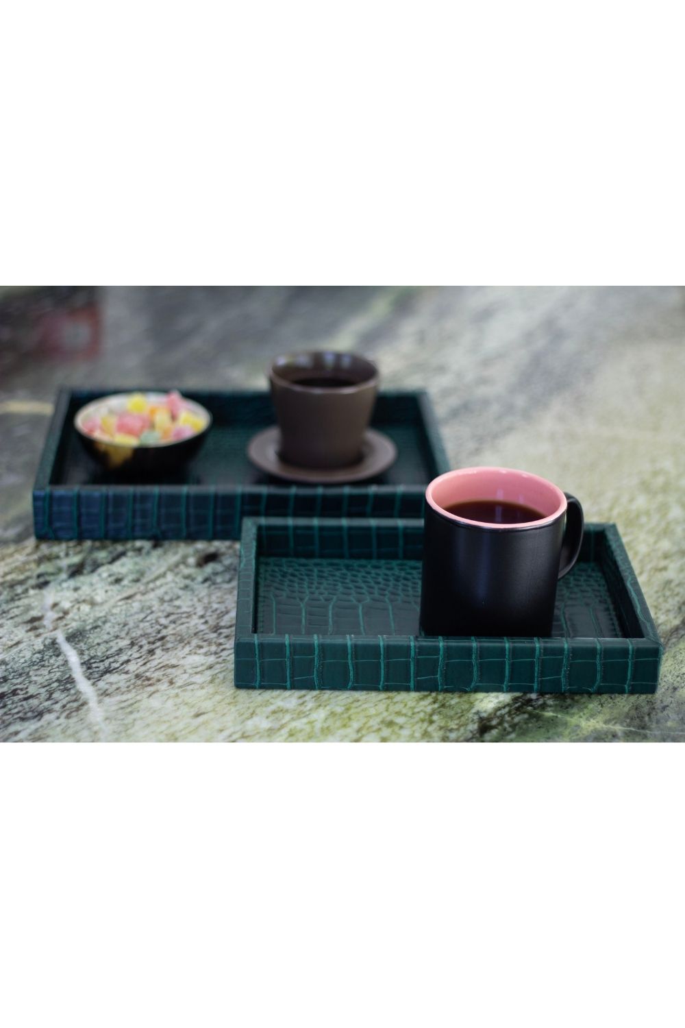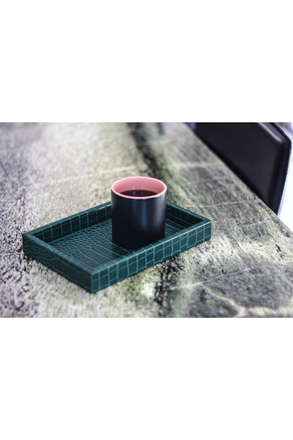 Mat dokusu ve zarif krokodil deseniyle dikkat çeken bu küçük  boy suni deri tepsi, hem dekoratif hem de fonksiyonel bir kullanım sunar. Koyu yeşil tonuyla modern ve sofistike bir görünüm kazanan bu özel tasarım, kaliteli suni deriden üretilmiştir. Sağlam yapısı sayesinde uzun ömürlüdür ve misafir sunumlarında, kahve servislerinde veya konsol üzerinde dekoratif obje olarak şıklıkla kullanılabilir.
