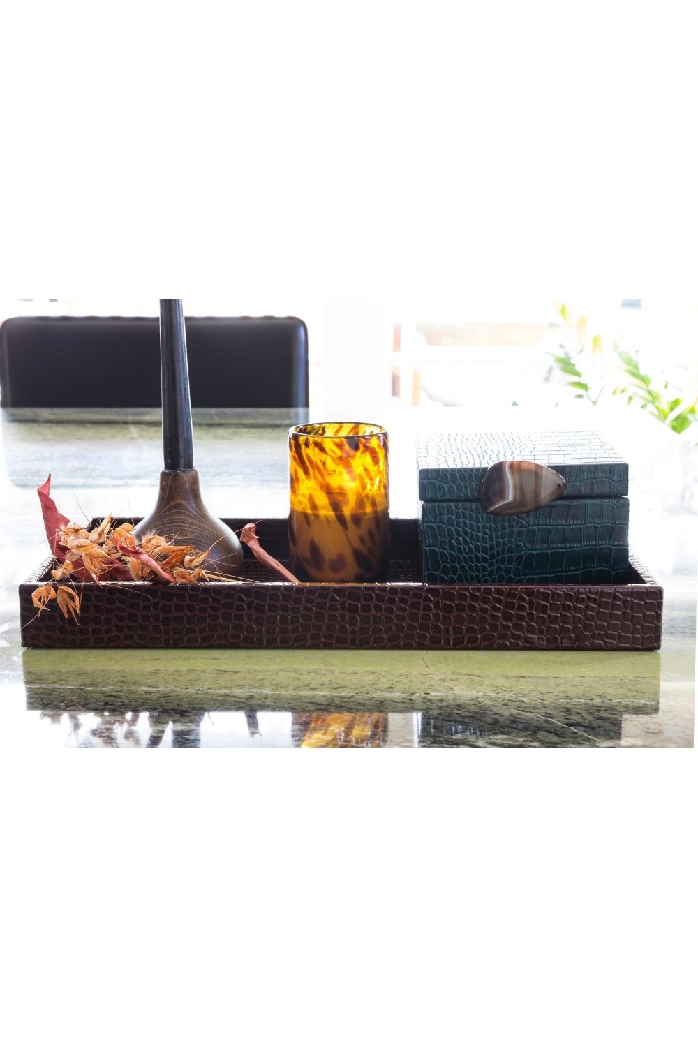 Lüks parlak dokusu ve krokodil desenli yüzeyiyle dikkat çeken bu büyük boy suni deri tepsi, hem dekoratif hem de fonksiyonel bir kullanım sunar. Parlak koyu kahverengi tonuyla zarafet ve modernliği bir araya getiren bu özel tasarım, kaliteli suni deriden üretilmiştir. Sağlam yapısı sayesinde uzun ömürlüdür ve misafir sunumlarında, kahve servislerinde veya konsol üzerinde dekoratif bir obje olarak şıklıkla kullanılabilir.