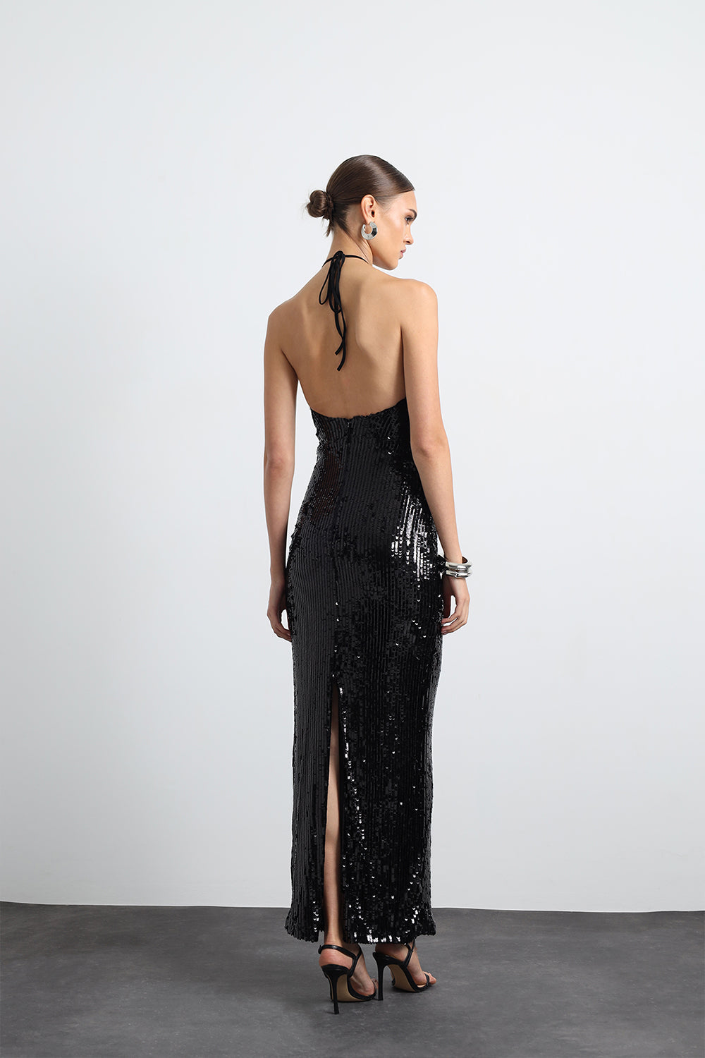 Fayelle Halter Yaka Payet Maxi Siyah Gece Elbisesi