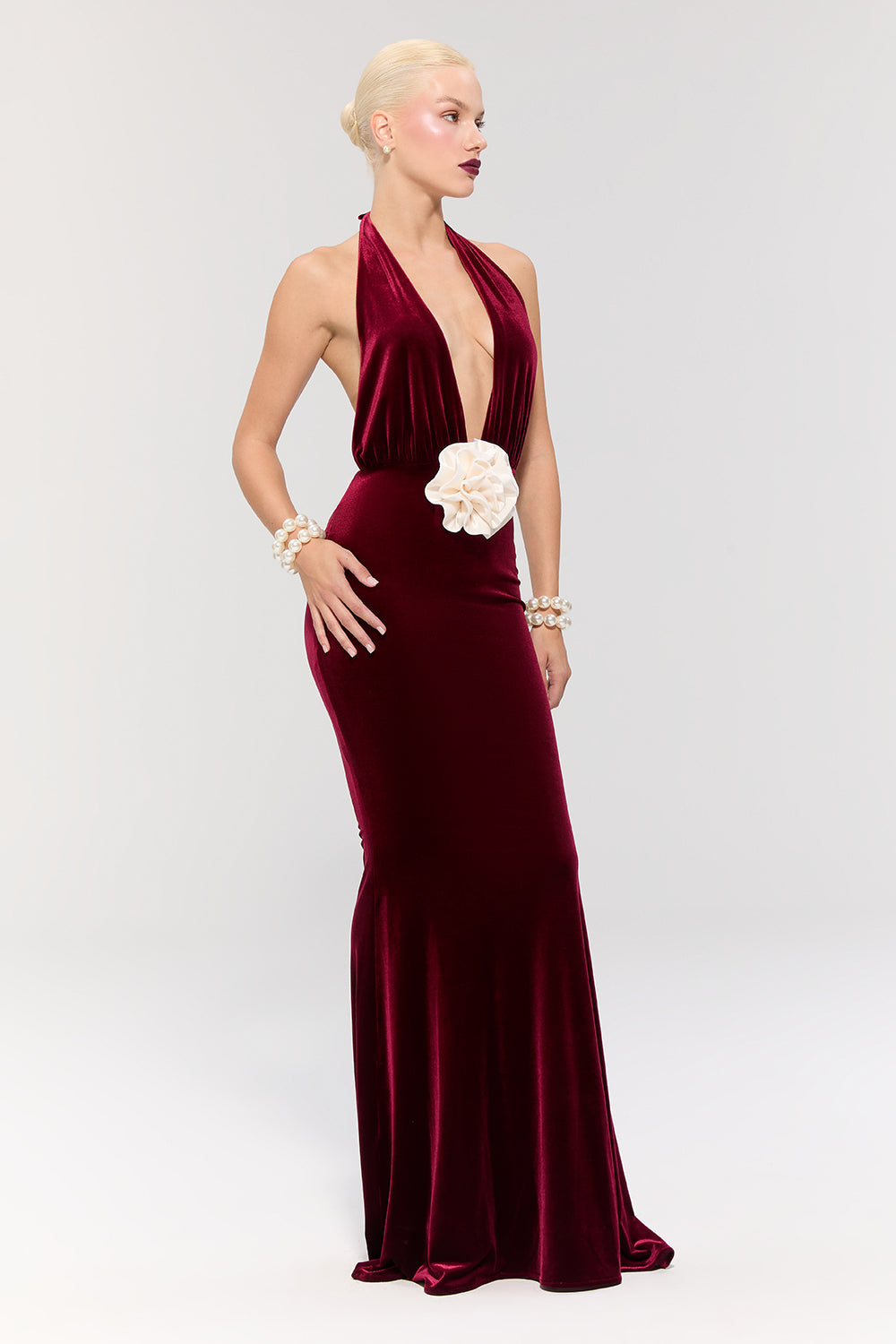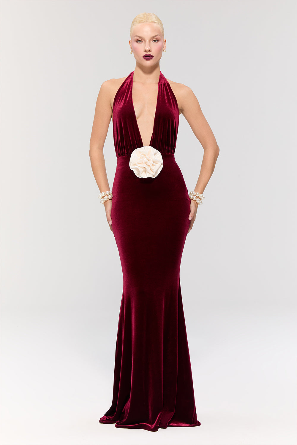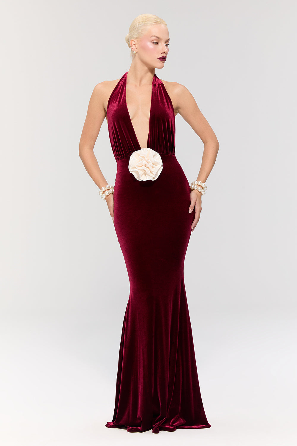 - Derin V yaka tasarımı ve sırt dekoltesi ile şıklığı ve zarafeti bir araya getirirken, bel kısmında yer alan büyük çiçek detayı, elbiseye feminen bir dokunuş katıyor.