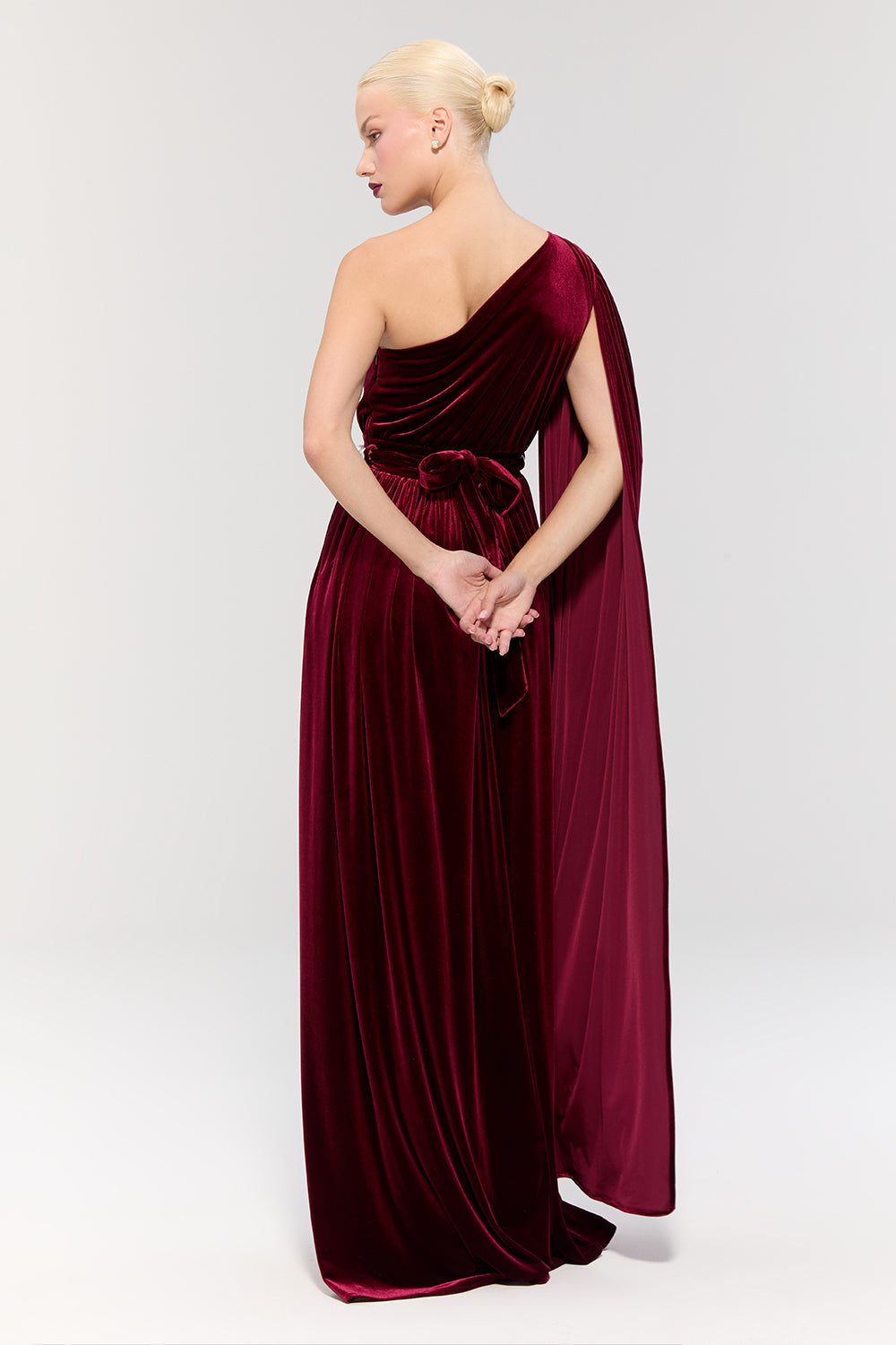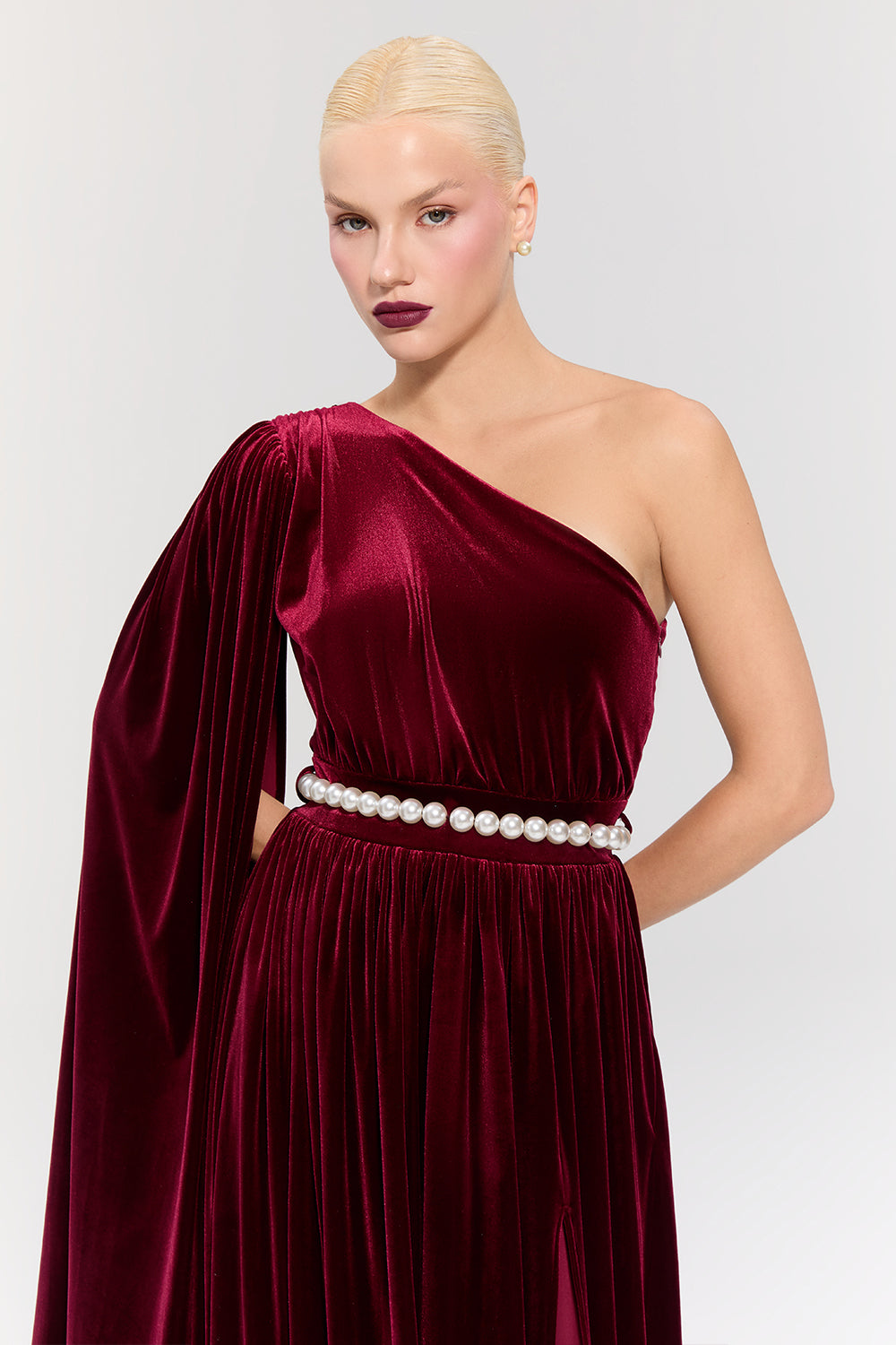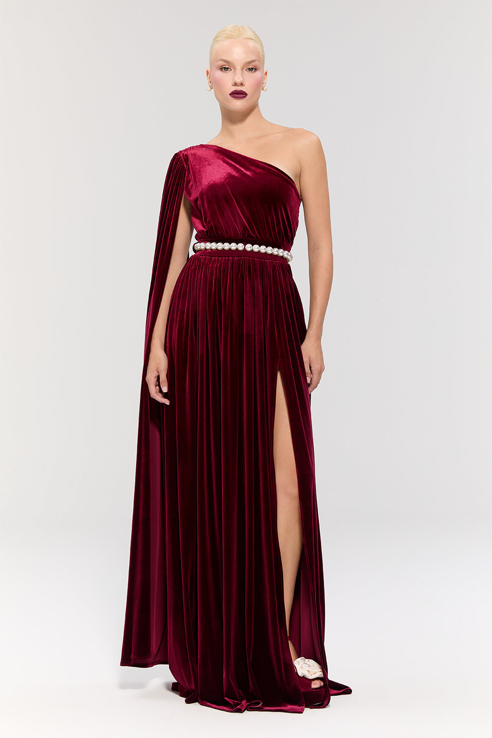 - Elbise, bordo kadife kumaşı ve tek omuzdan dökülen uzun pelerini ile sofistike ve zarif bir silüet sunar.
