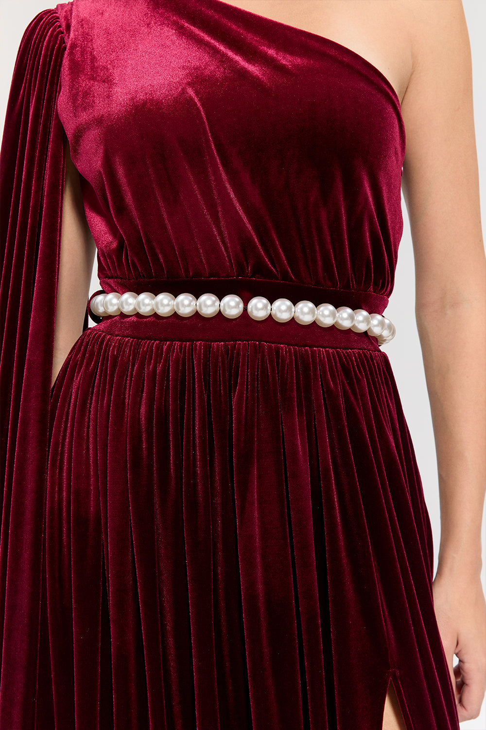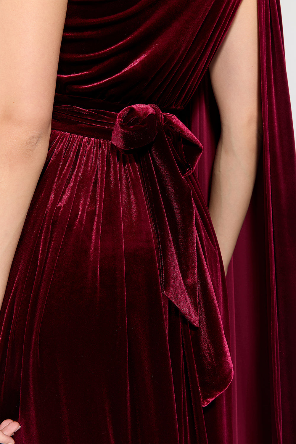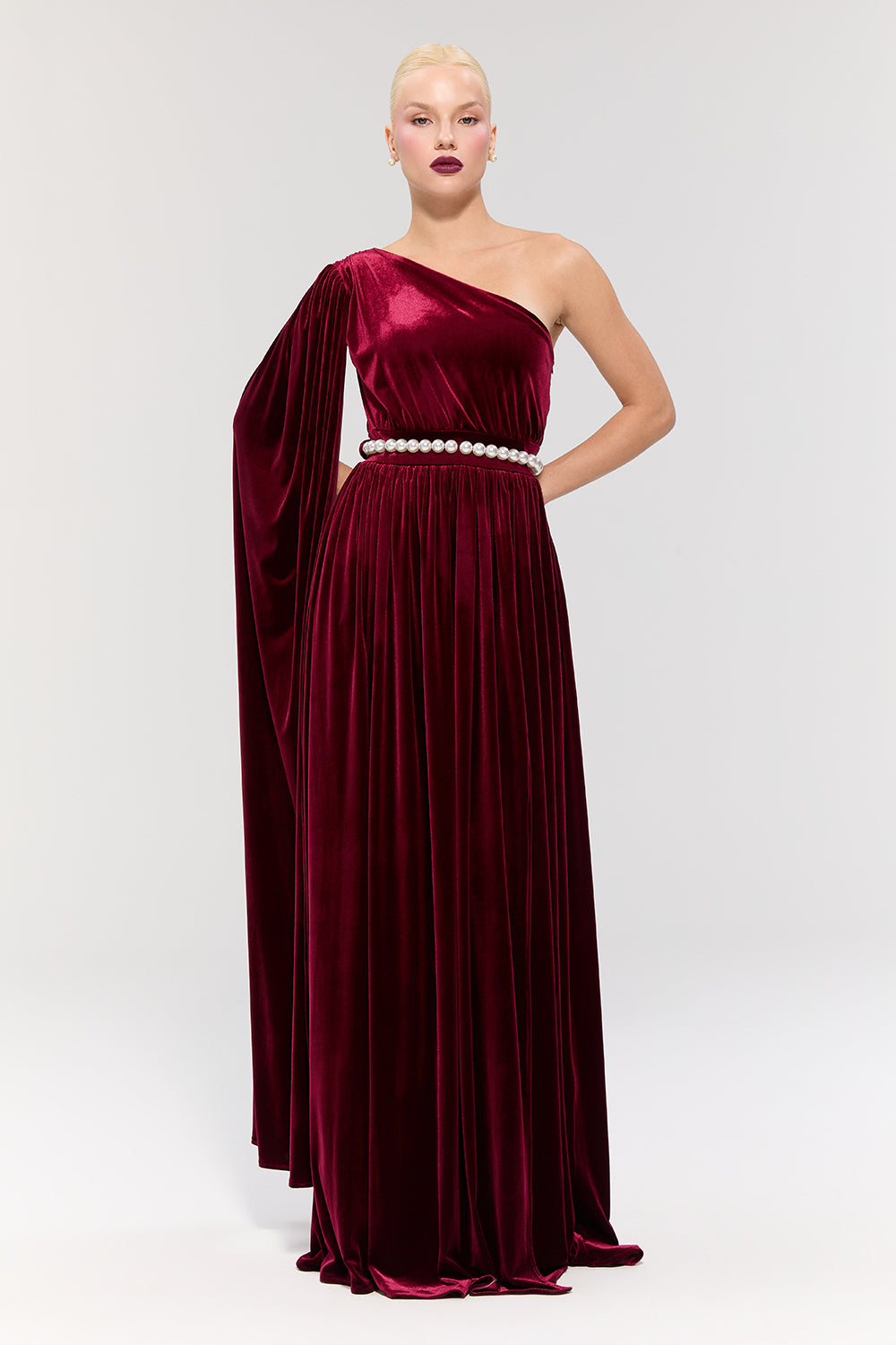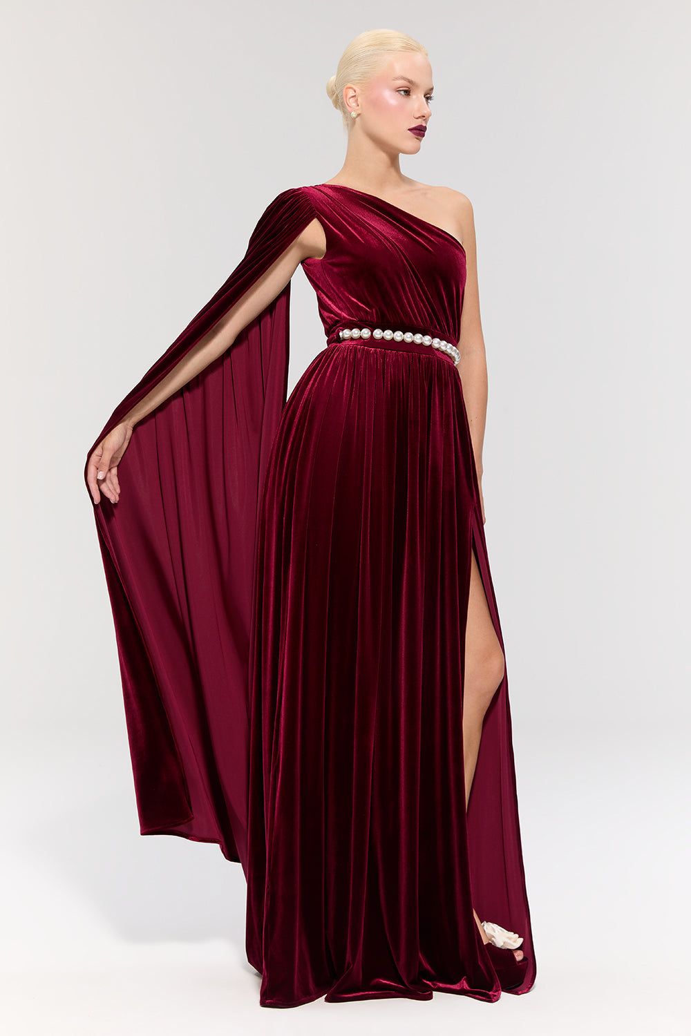 - Elbise, bordo kadife kumaşı ve tek omuzdan dökülen uzun pelerini ile sofistike ve zarif bir silüet sunar.