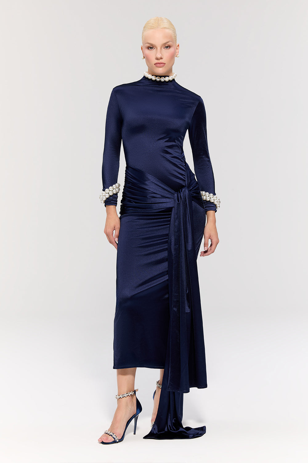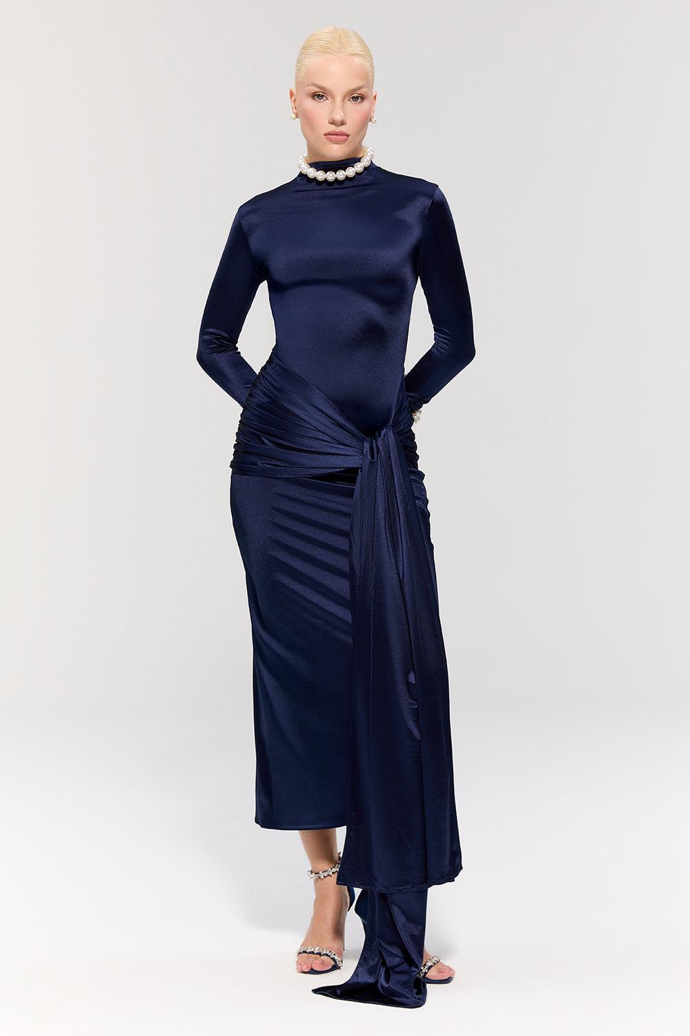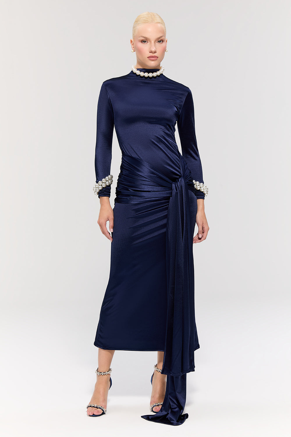 • Elbise, lacivert parlak kumaşıyla göz alıcı bir şıklık sunar.