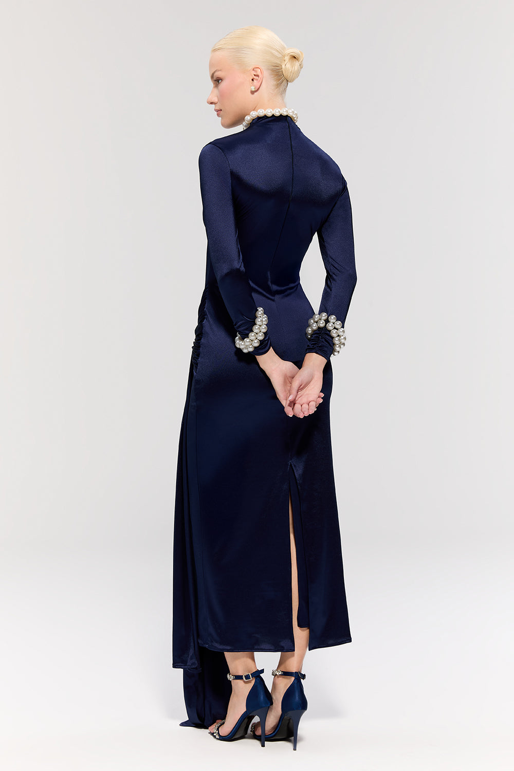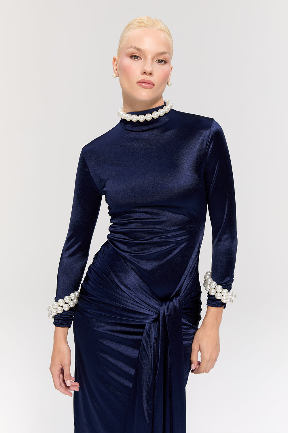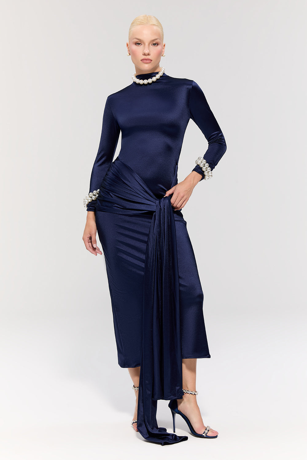 • Elbise, lacivert parlak kumaşıyla göz alıcı bir şıklık sunar.