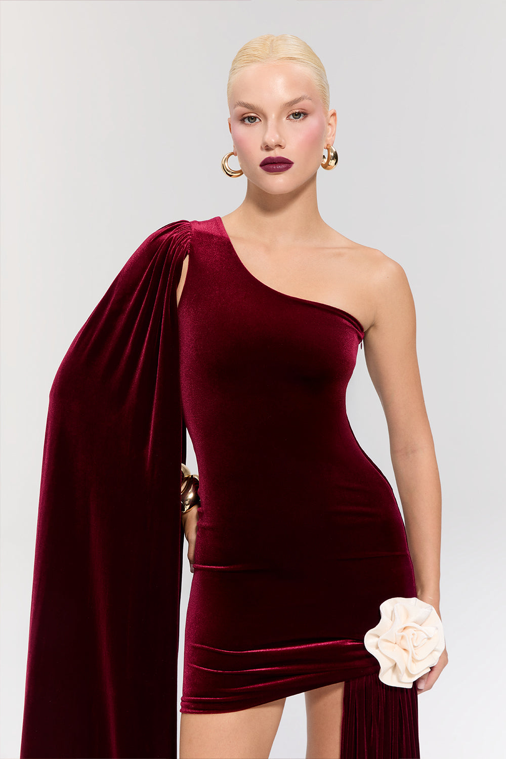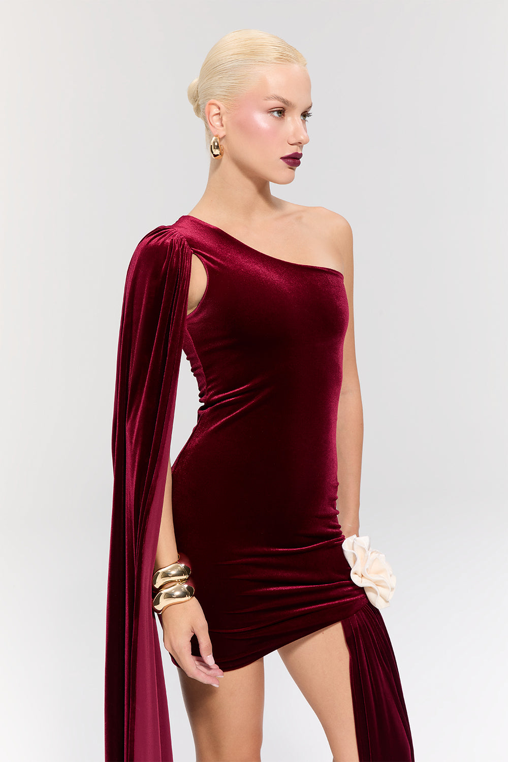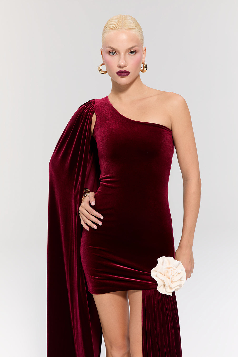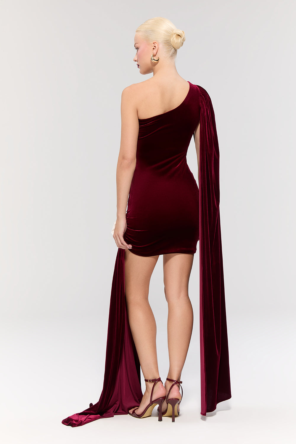 - Sol omuzda asimetrik kesimi ve vücuda oturan formuyla sofistike bir görünüm sunar.
