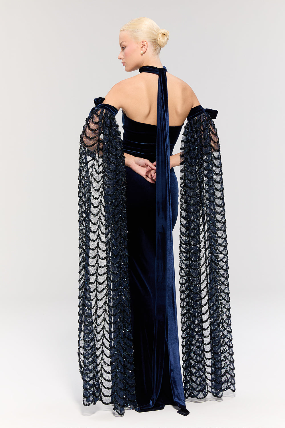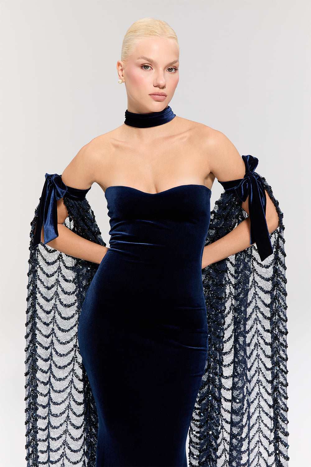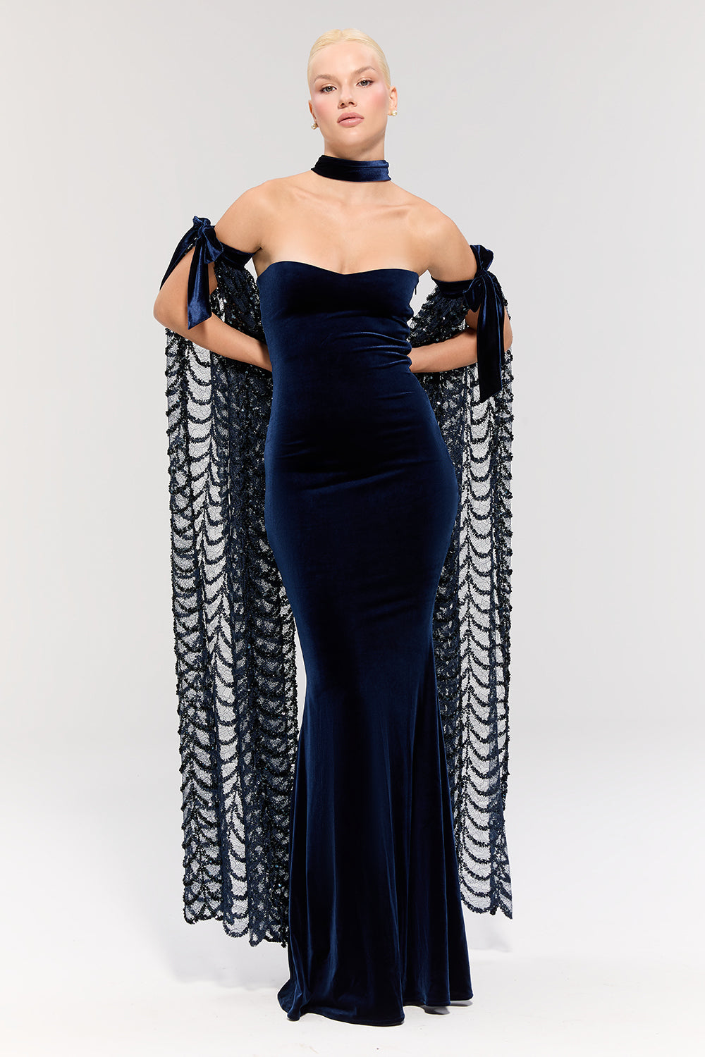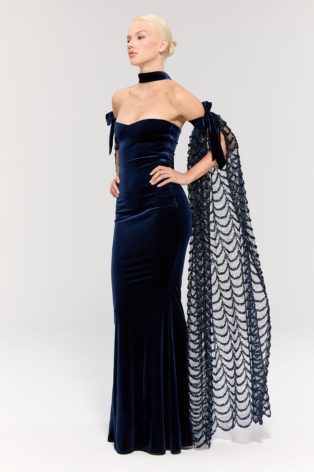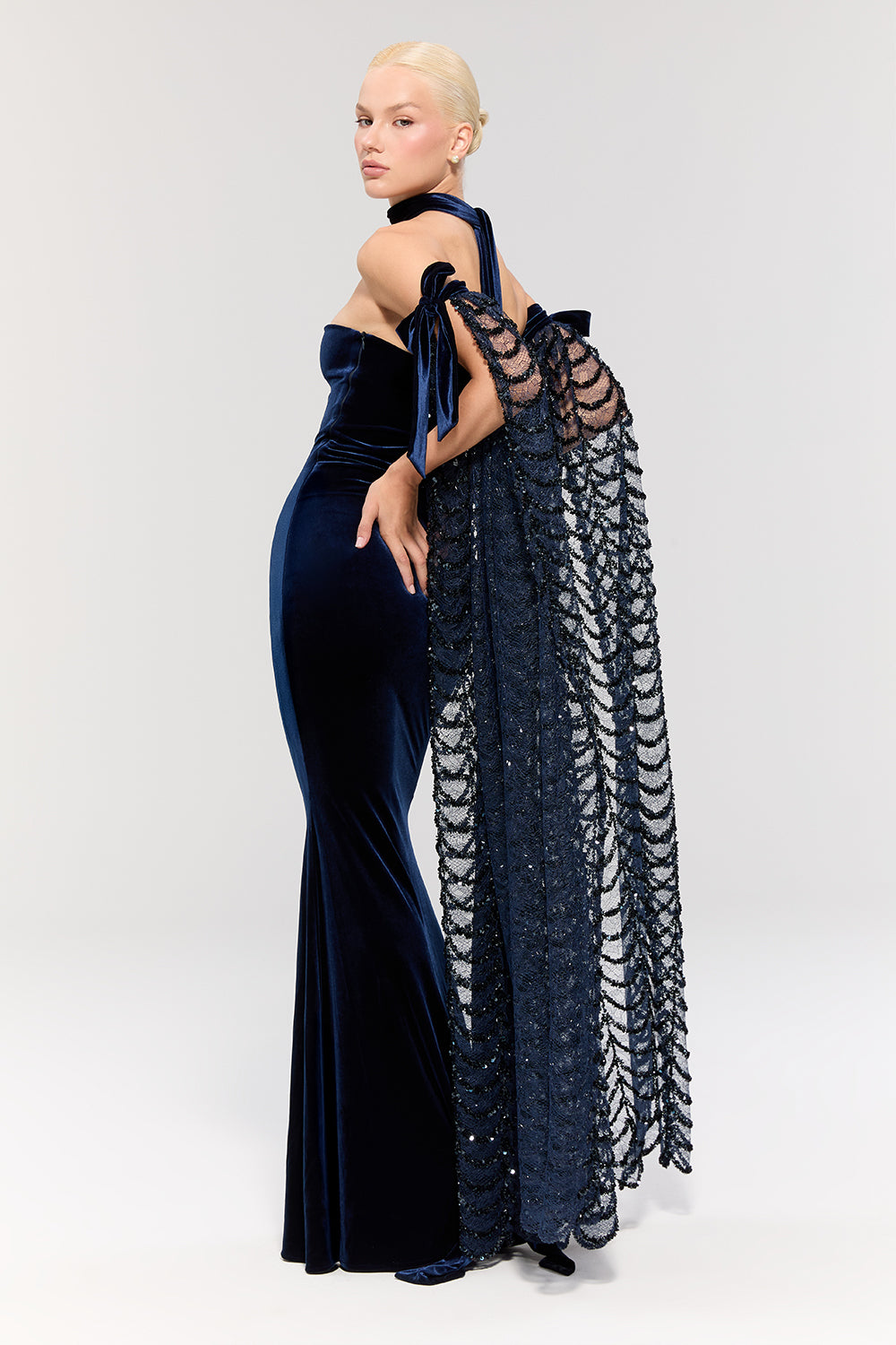- Elbise, uzun balık modeli ve lacivert kadife dokusuyla zarif bir silüet sunar.
