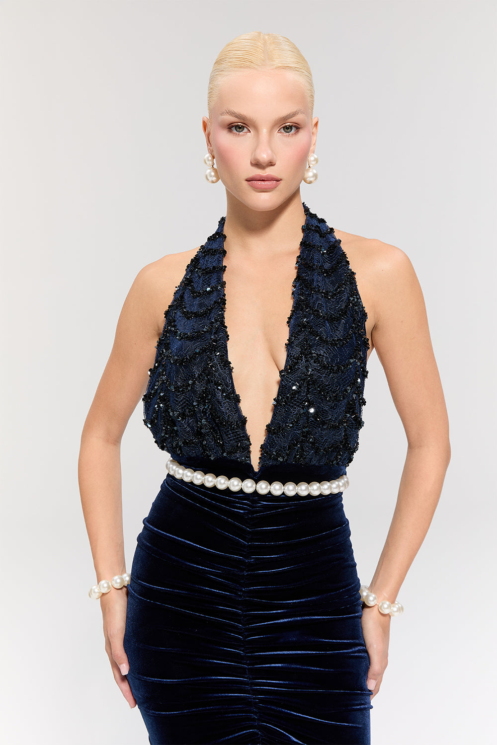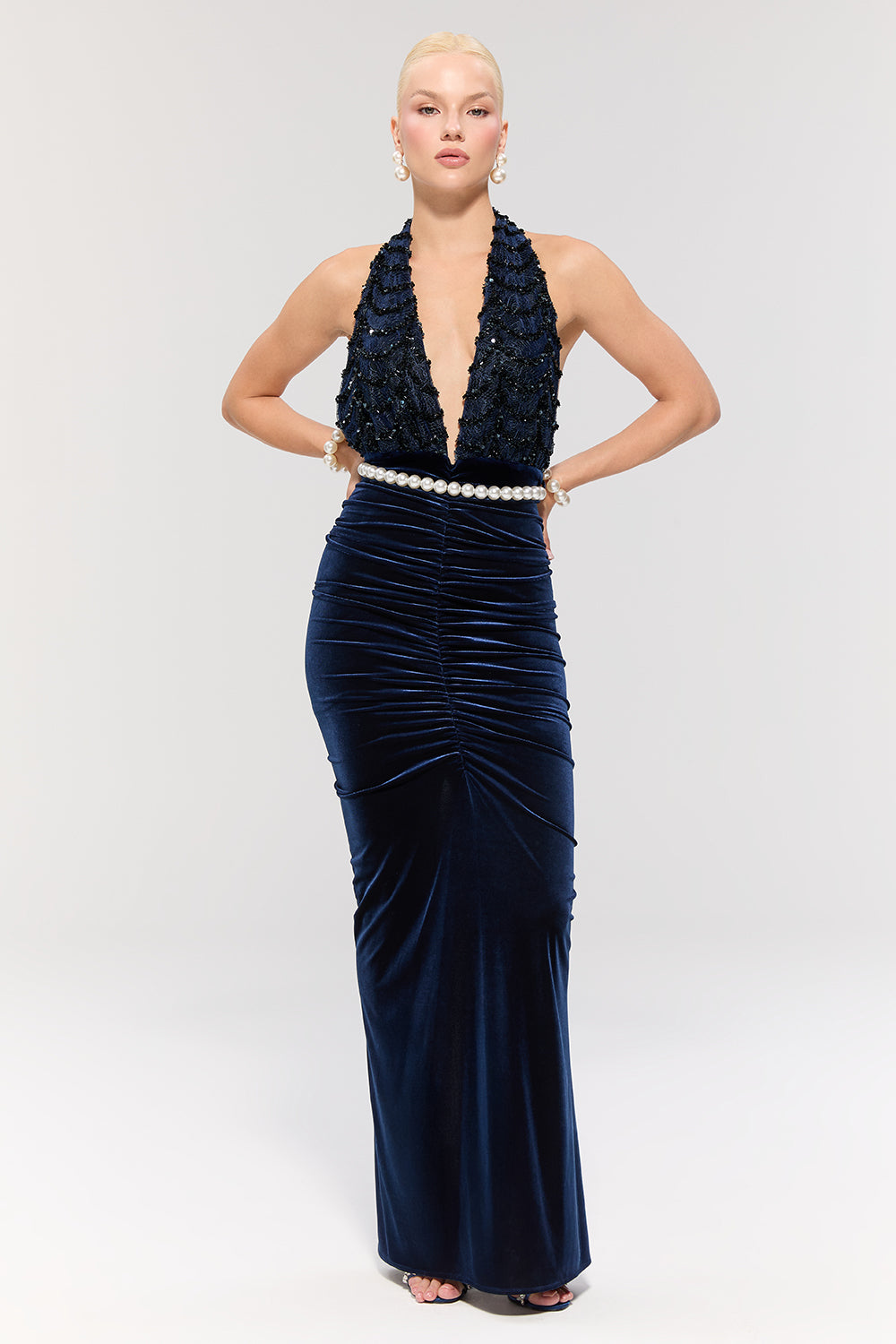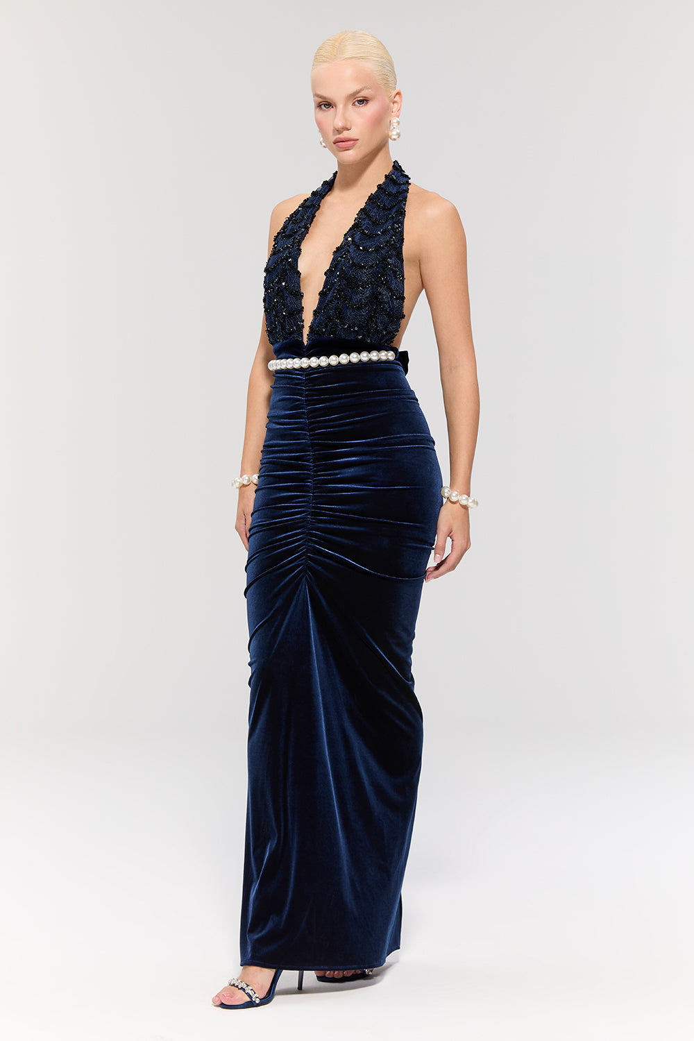 • Lacivert kadife dokusu asil bir şıklık sunarken, belindeki inci kemer zarif bir ışıltı katar.